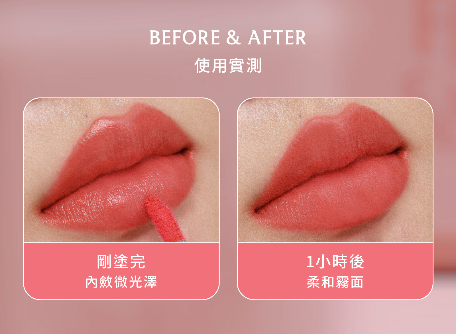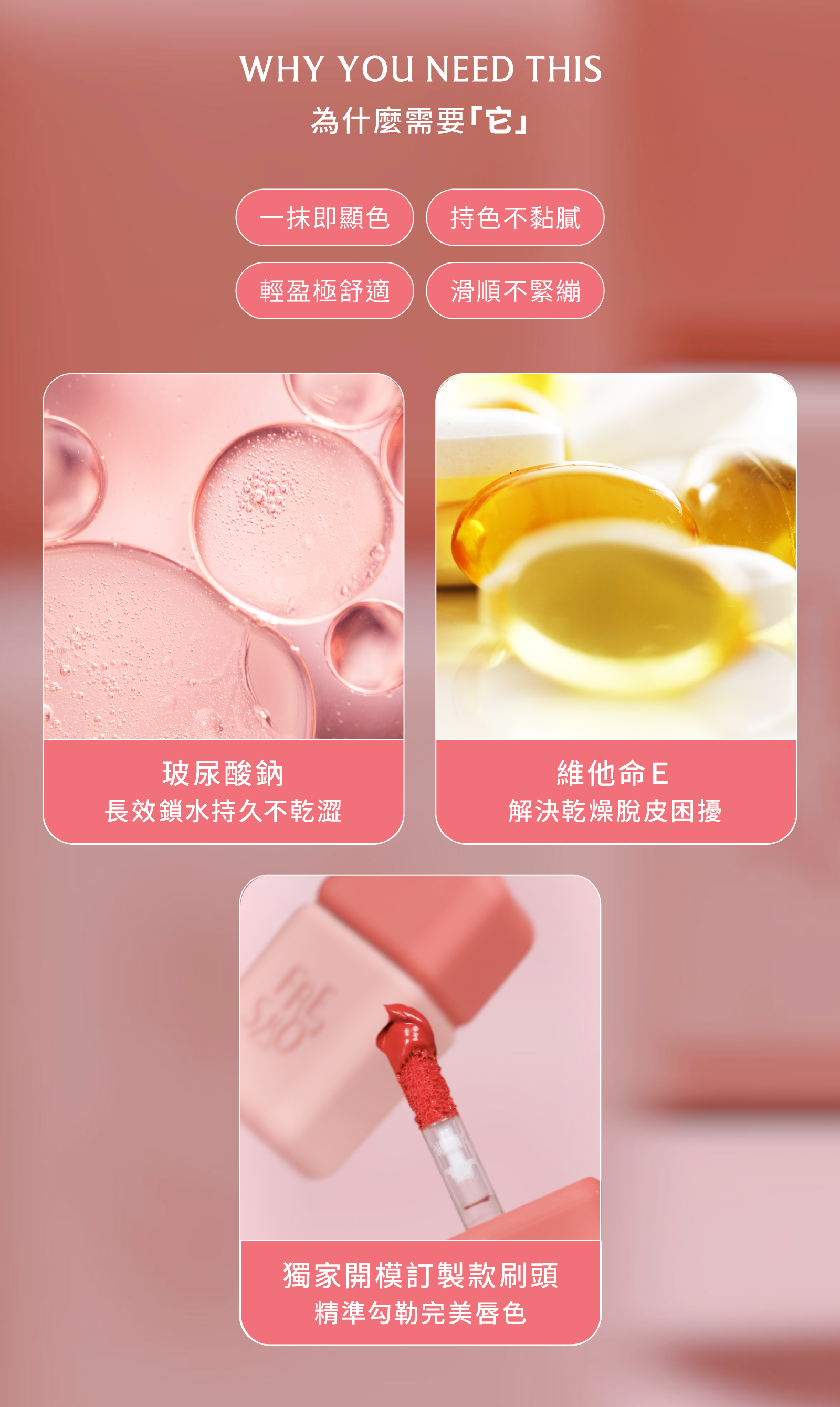 輕盈質地上唇無負擔,添加玻尿酸鈉與維他命E等保養萃取,完美展現滑嫩雙唇,色澤飽和不顯唇紋。