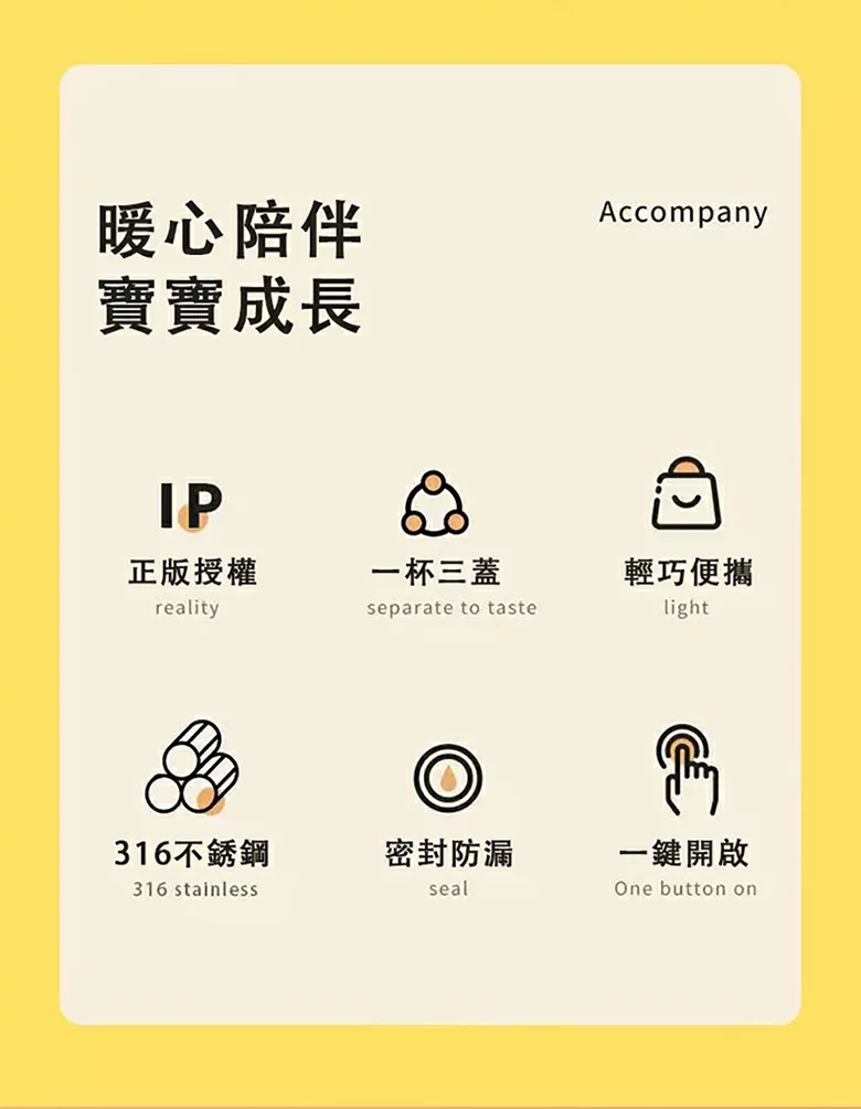 三蓋設計:可隨意切換飲水方式,滿足不同時刻喝水需求,帶來喝水新概念。大容量:630ml容量,裝滿一杯就能滿足寶寶一天飲水需求,讓你暢快喝水每一天。優質材質:採用進口 Tritan 材質,屬母嬰級材質,健康無異味,還防燙、耐高溫。防漏設計:配有安全鎖扣,防漏且雙重保護防誤觸,開鎖閉鎖僅需一步;同時具備 360° 防漏設計,倒置不滴也不漏,密封防漏避免搖晃噴灑。易清潔:全身可拆卸水洗,杯身可拆卸設計,不給污漬留機會,清潔無負擔。細節貼心:安全鎖扣防誤觸開啟;杯身硅膠圈舒適防滑;環保油墨印花耐磨防刮花。