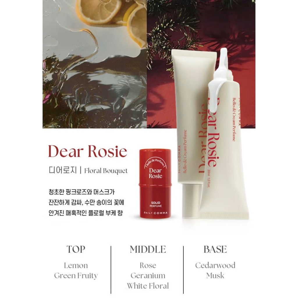 🌹 Dear Rosie | Floral Bouquet 浪漫玫瑰浪漫玫瑰 × 溫柔麝香• 前調:檸檬、綠意果香• 中調:玫瑰、天竺葵、白花香• 後調:雪松、麝香
