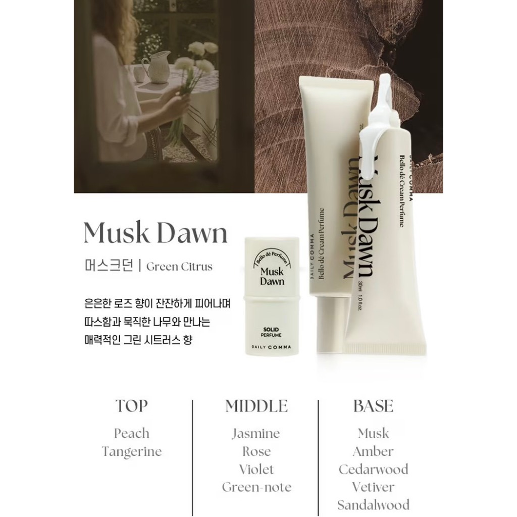 🌿 白色|Musk Dawn | Green Citrus 晨曦麝香|白綠意柑橘 × 木質溫暖• 前調:蜜桃、橘子• 中調:茉莉、玫瑰、紫羅蘭、綠意• 後調:麝香、琥珀、雪松、岩蘭草、檀香