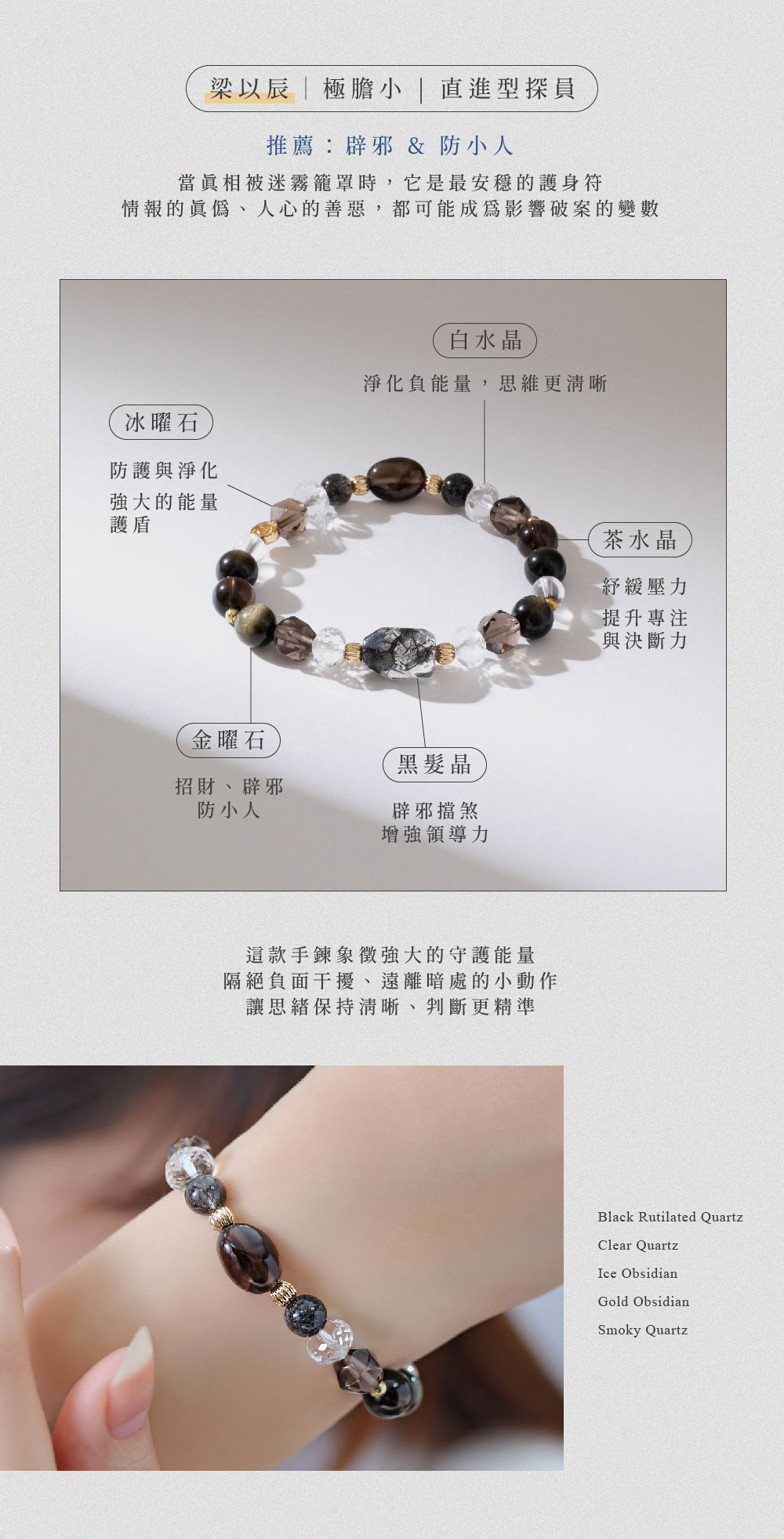 ◦ 黑髮晶 | 辟邪, 防小人, 清除負能量◦ 白水晶 | 淨化消磁, 提升專注力◦ 冰曜石 | 辟邪, 招財旺運, 清除負能量◦ 金曜石 | 避邪, 招財, 清除負能量◦ 茶水晶 | 招財, 提升專注力, 舒緩壓力