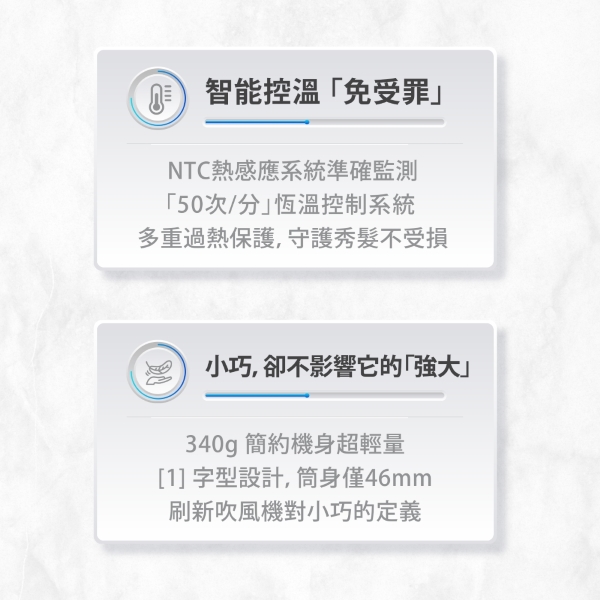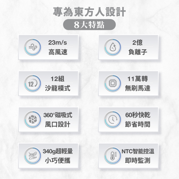 340g 超輕量機身11萬轉23 m/s 高風速創新1字型設計2億負離子12種乾髮模式NTC熱感應系統 1,200次/秒智能控溫過熱保護裝置集風嘴 / 柔風嘴可拆式濾網自清潔模式