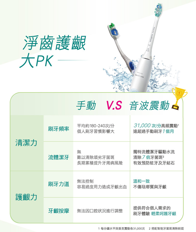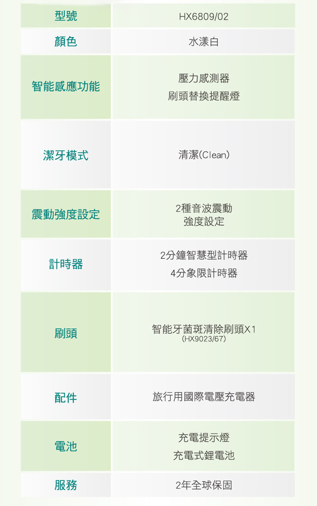 商品規格 品牌 PHILIPS飛利浦 型號 HX6809 產地 中國 類型 超音波振動式 尺寸(長x寬x高)(mm) 24*11*6.5公分電源類型 充電式 電源 100~240V 重量(g) 393潔牙模式 清潔 刷頭數量 x1 國際電壓 有國際電壓 其它配件 充電座+中文說明書+保證書適用對象 成人,兒童保固年限 2年 個人衛生用品 個人衛生用品