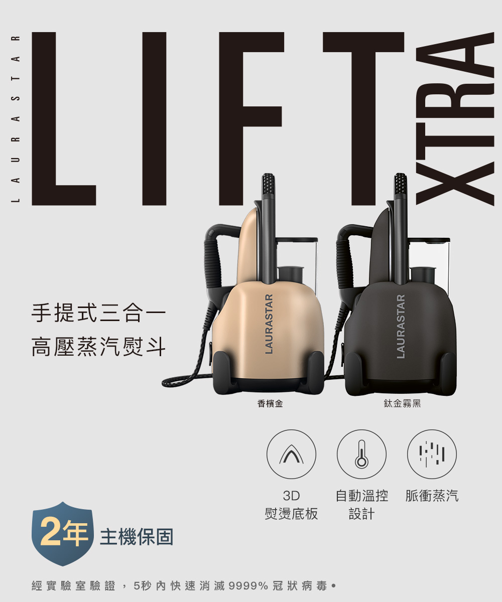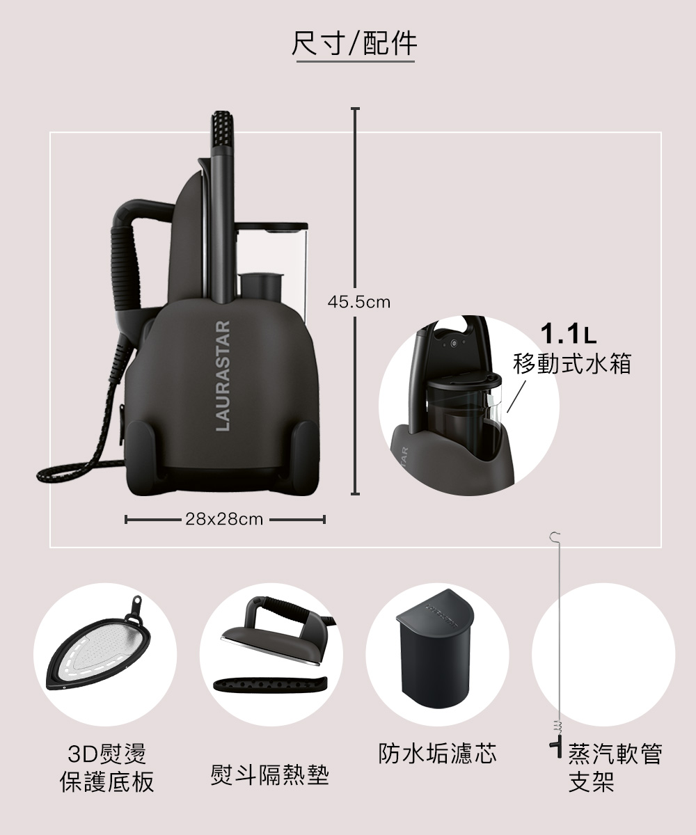 品牌:LAURASTAR 品牌國別:瑞士 品名:LAURASTAR LIFT XTRA 高壓蒸汽熨斗-鈦金霧黑 型號:LIFT XTRA 顏色:鈦金霧黑 國際條碼: 製造國:歐盟 保證期:二年 商品尺寸: 275 x 455 x 275 mm (W x H x D)外型尺寸:275 x 455 x 275 mm (W x H x D) 商品淨重(kg):5.3~5.5 kg 總功率:1450瓦 蒸氣壓力:350千帕(3.5bar) 水箱容量:~1.1L 電源:110V , 60Hz 熨斗重量:~1 kg 總重量:5.3~5.5 kg 配件:濾水盒、防護底板、隔熱底板、蒸汽管支架👉🏻功能