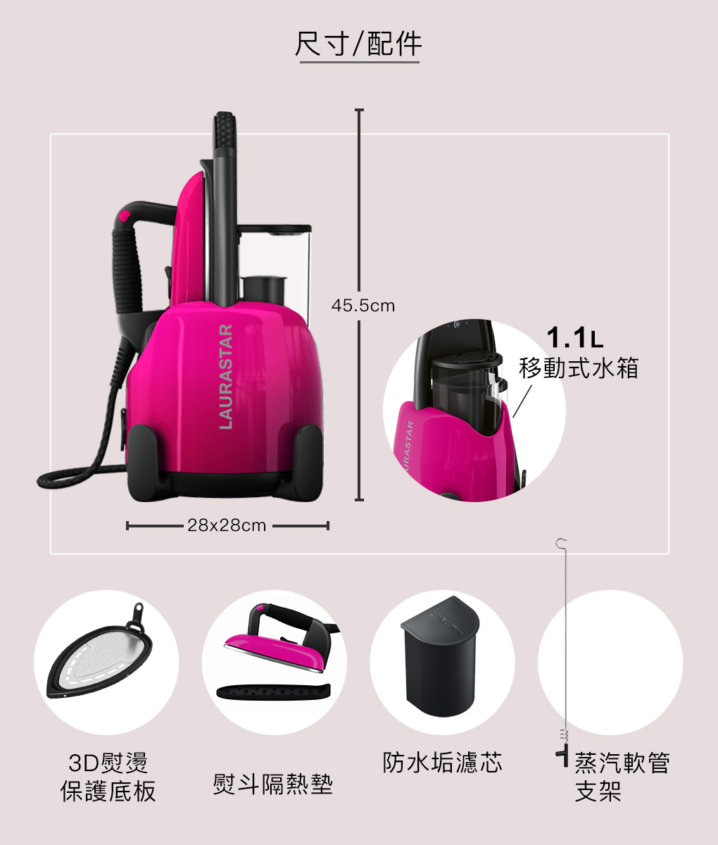 品牌:LAURASTAR 品牌國別:瑞士 品名:LAURASTAR LIFT PLUS 高壓蒸汽熨斗-桃紅色 型號:LIFT PLUS 顏色:桃紅色 國際條碼:790776015321 製造國:歐盟 保證期:二年 商品尺寸: 275 x 455 x 275 mm (W x H x D) 商品淨重(kg):5.3~5.5 kg 總功率:1450瓦 蒸氣壓力:350千帕(3.5bar) 水箱容量:~1.1L 電源:110V 60Hz 熨斗重量:~1 kg 總重量:5.3~5.5 kg 外型尺寸:275 x 455 x 275 mm (W x H x D)配件:濾水盒、防護底板、隔熱底板、蒸汽管支架👉🏻功能