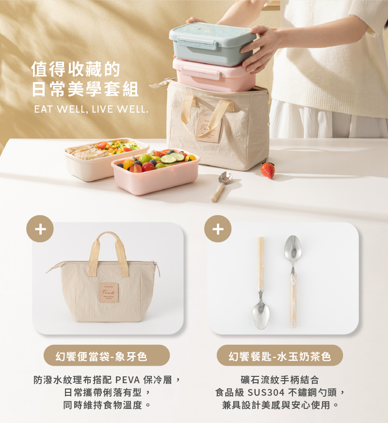 【內容物】• 彩璃系列幻饗盒*1(可選色)• 幻饗便當袋-象牙色*1• 幻饗餐匙-水玉奶茶色*1