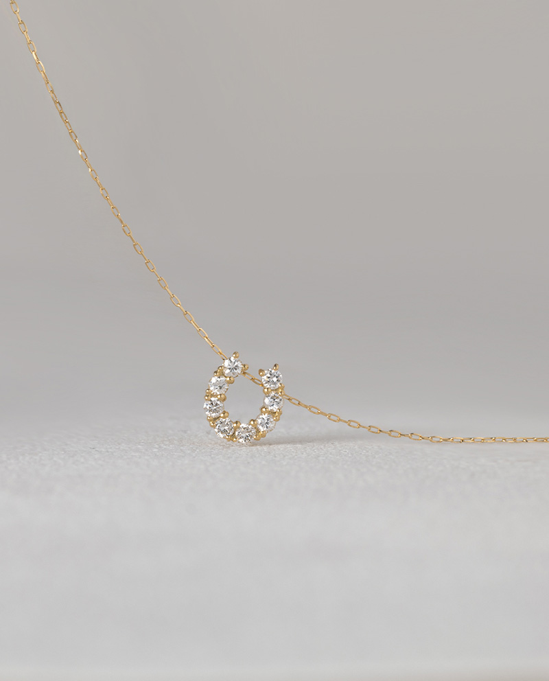 以「幸運馬蹄」為核心意象,將象徵祝福與守護的經典符號,轉化為輕盈、極簡、可每日配戴的鑽石項鍊/開口向上設計象徵承接好運、聚集幸福,寓意長久與守護/鑽石等級:D Color(無色最高等級)總重0.2ct,多顆鑽石排列,均勻鑲嵌於馬蹄輪廓上,形成細緻連續的光感,絕美閃亮