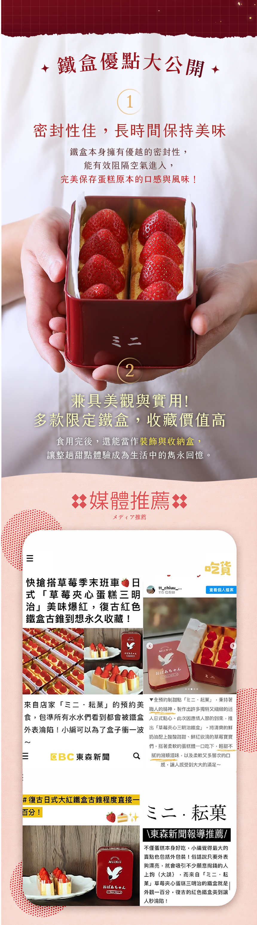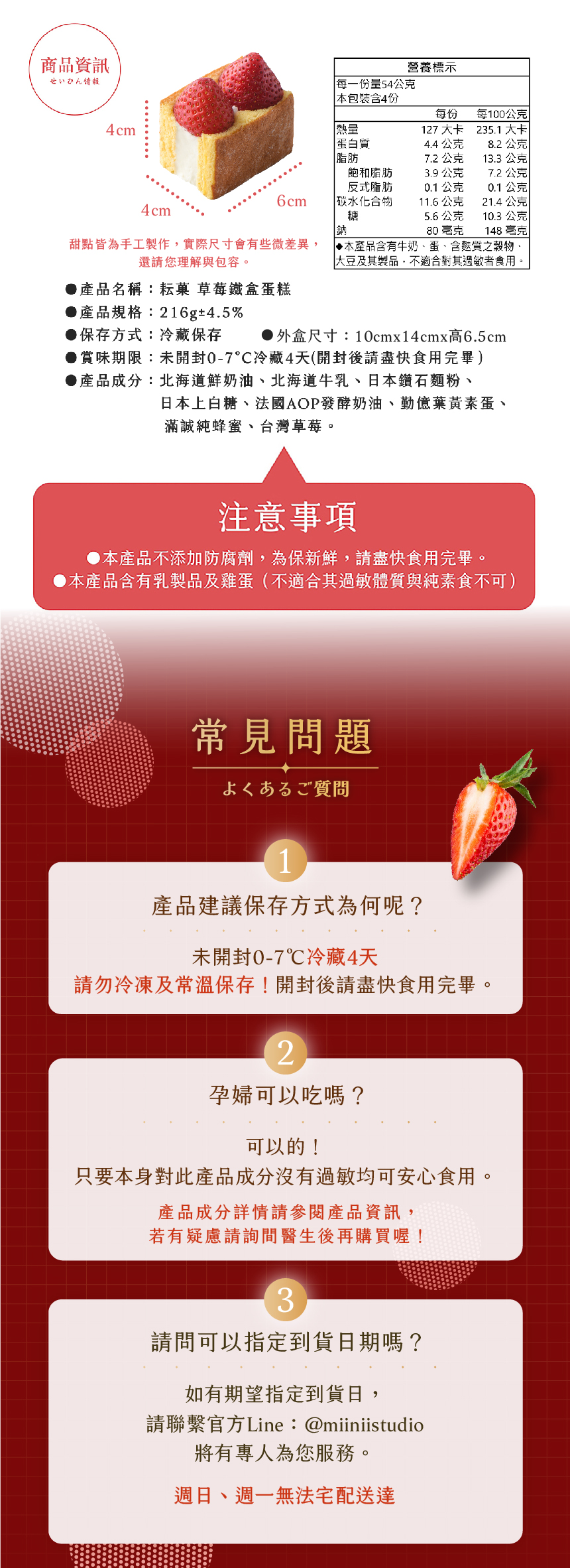 ・本商品無法提供換貨服務,如需其他商品請您重新購買。・甜點出貨前均經嚴格品質管制確保甜點完整性,如到貨後發現因作業程序錯誤,導致寄送商品與訂購數量、品項不符,或訂購之商品包裝內容物有瑕疵 ( 物流運送過程造成嚴重毀損及失溫 ),請於收到商品的24小時內拍照或錄影,並立即與官方LINE@miiniistudio 客服人員聯繫。・在未完成退貨程序前,請務必保留包裹收件時的原樣,避免影響貨故判定結果。・即使品質的控管及保護措施完善,甜點冷藏宅配仍有一定的風險,車體運送途中可能造成水果與蛋糕輕微位移、或些許裝飾掉落,恕不在貨故申請範圍內,訂購時請評估是否能承擔接受。