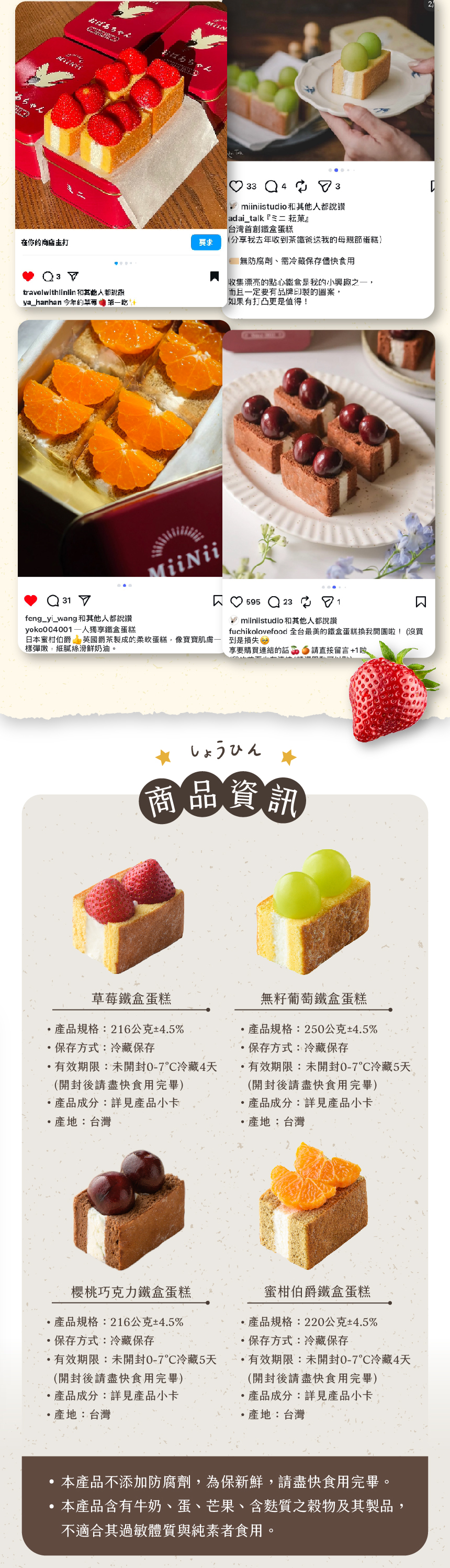 ・本商品無法提供換貨服務,如需其他商品請您重新購買。・甜點出貨前均經嚴格品質管制確保甜點完整性,如到貨後發現因作業程序錯誤,導致寄送商品與訂購數量、品項不符,或訂購之商品包裝內容物有瑕疵 ( 物流運送過程造成嚴重毀損及失溫 ),請於收到商品的24小時內拍照或錄影,並立即與官方LINE@miiniistudio 客服人員聯繫。・在未完成退貨程序前,請務必保留包裹收件時的原樣,避免影響貨故判定結果。・即使品質的控管及保護措施完善,甜點冷藏宅配仍有一定的風險,車體運送途中可能造成水果與蛋糕輕微位移、或些許裝飾掉落,恕不在貨故申請範圍內,訂購時請評估是否能承擔接受。