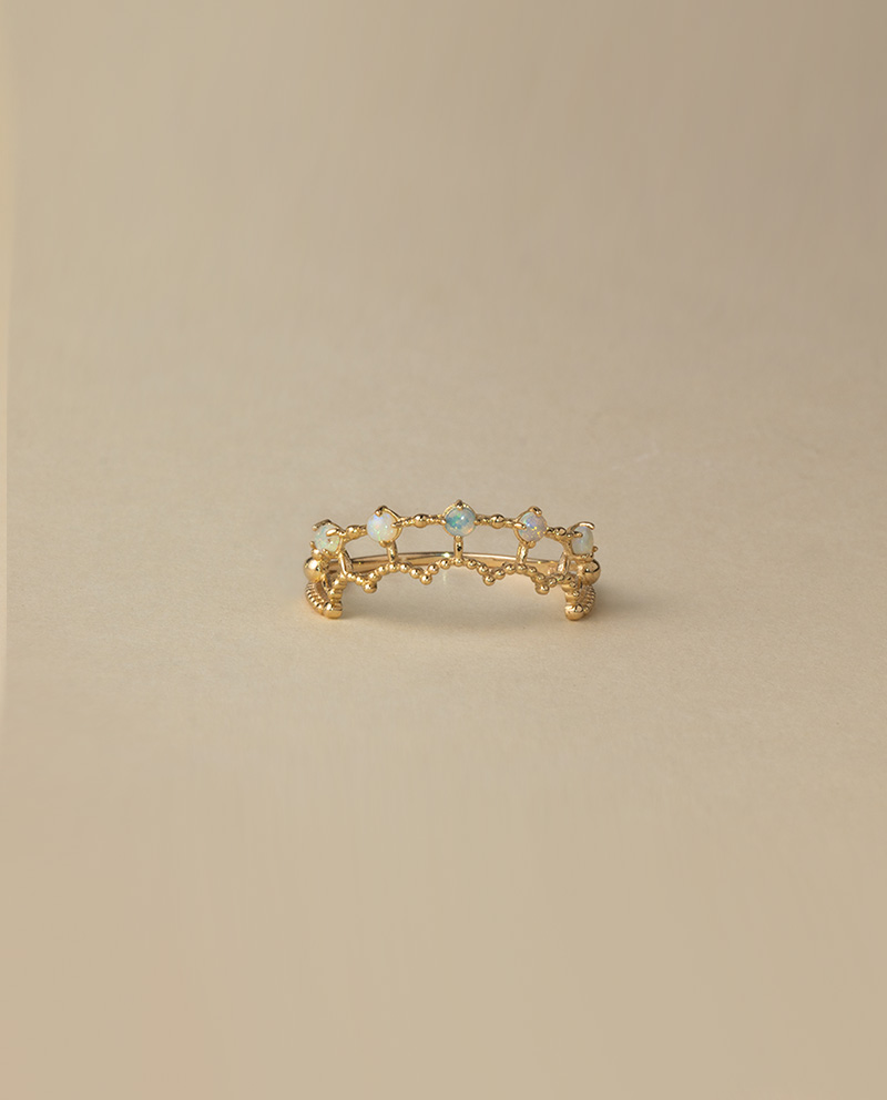 這款戒指以「王冠」為靈感核心,透過細膩的鏤空結構與微珠邊金工,營造出宛如小巧王冠環繞指間的造型。不同於傳統王冠的厚重或銳角,設計師以柔和的曲線取代尖銳稜角,使整體更具夢幻與女性化氣息/戒環上半部以連續的尖拱造型呈現王冠頂端曲線,每個拱間搭配小圓珠裝飾,展現出古典歐式珠寶的細膩語彙/K10金呈現出溫潤的金色調,不過於濃烈,能襯托蛋白石的變彩光感,與整體「柔光王冠」的主題相呼應/