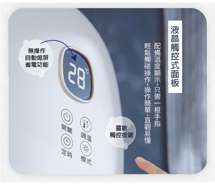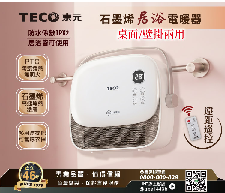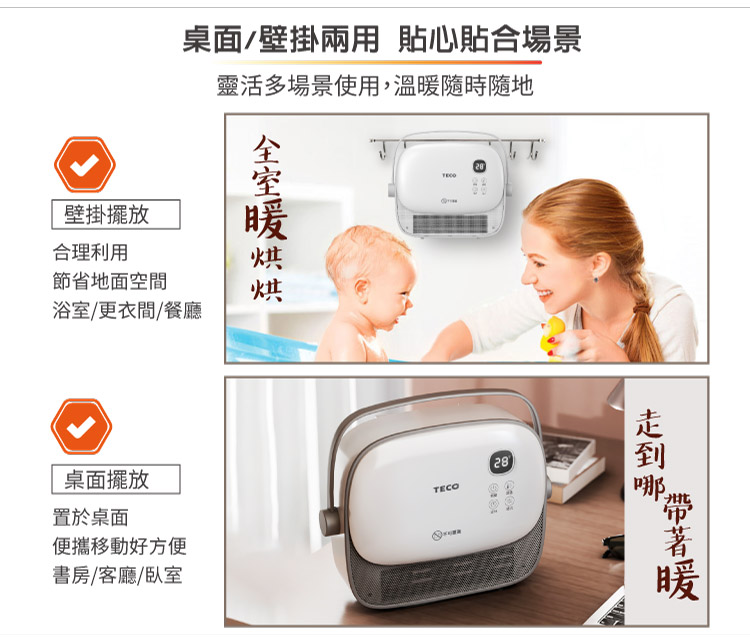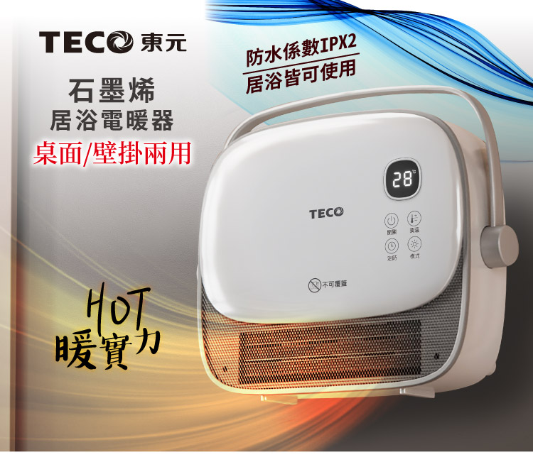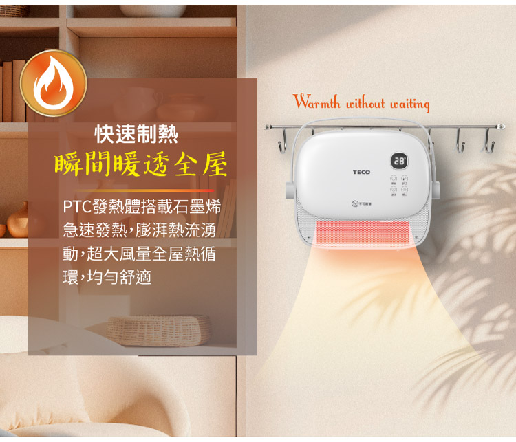 商品特色採用石墨烯+PTC陶瓷雙超導熱體 壁掛免安裝,桌面/壁掛兩用 觸控式按鍵,LED智慧顯示屏 智能變頻恆溫調節,恆溫舒適 多用途提把可當烘乾小件衣物架 浴室/臥房/客廳多場所使用商品規格商品品牌:TECO東元 商品型號:XYFYN3007CBW 電壓頻率:110V / 60Hz 消耗功率:1200W 商品尺寸:(寬)340x(深)103x(高)305mm 商品重量:1.95kg 材 質:PTC陶瓷發熱體+石墨烯塗層 配 件:遙控器 BSMI商品認證字號:R73998