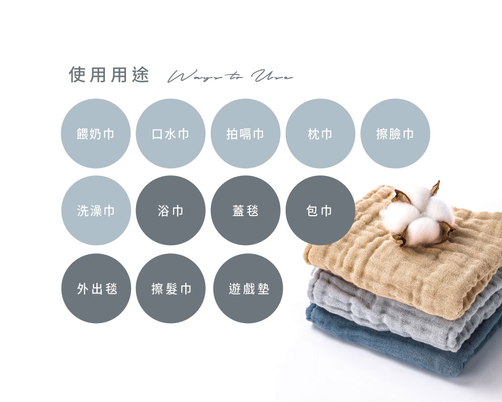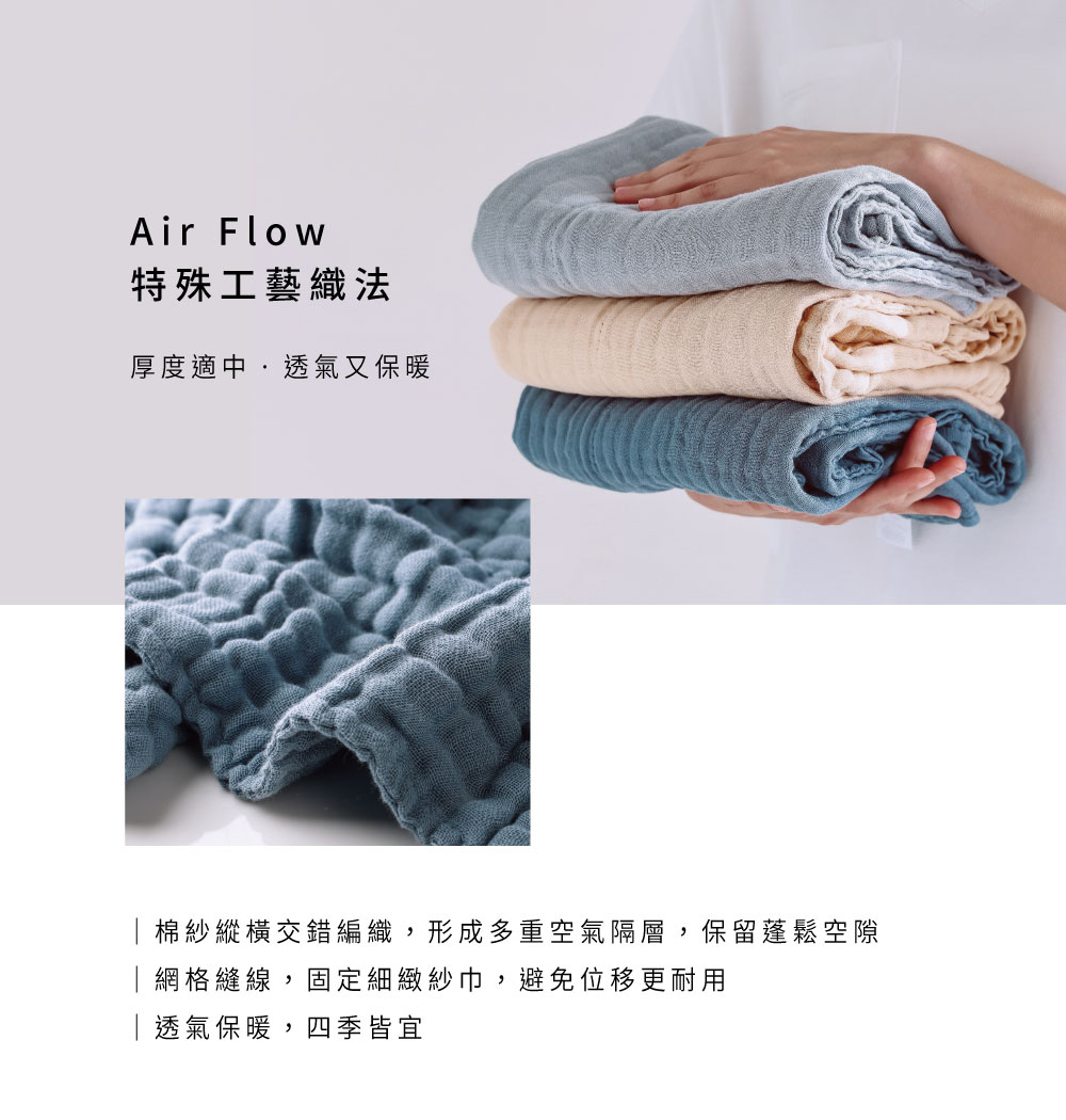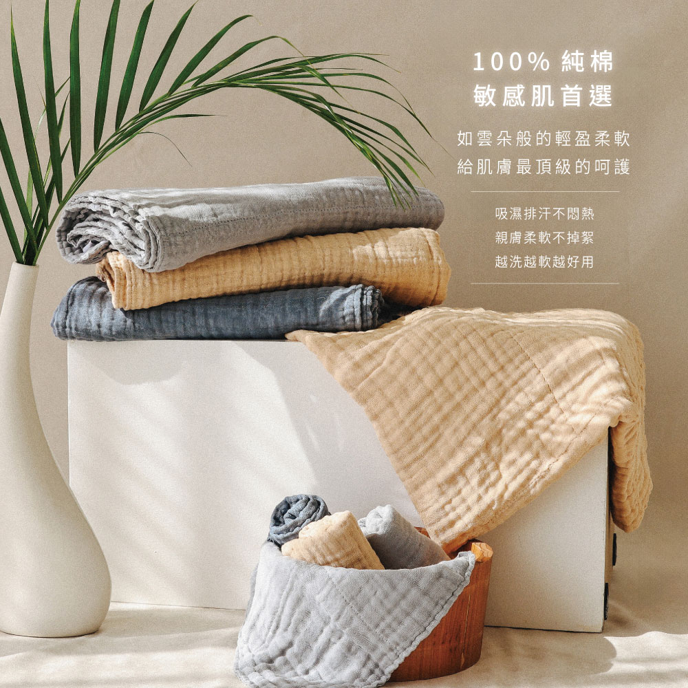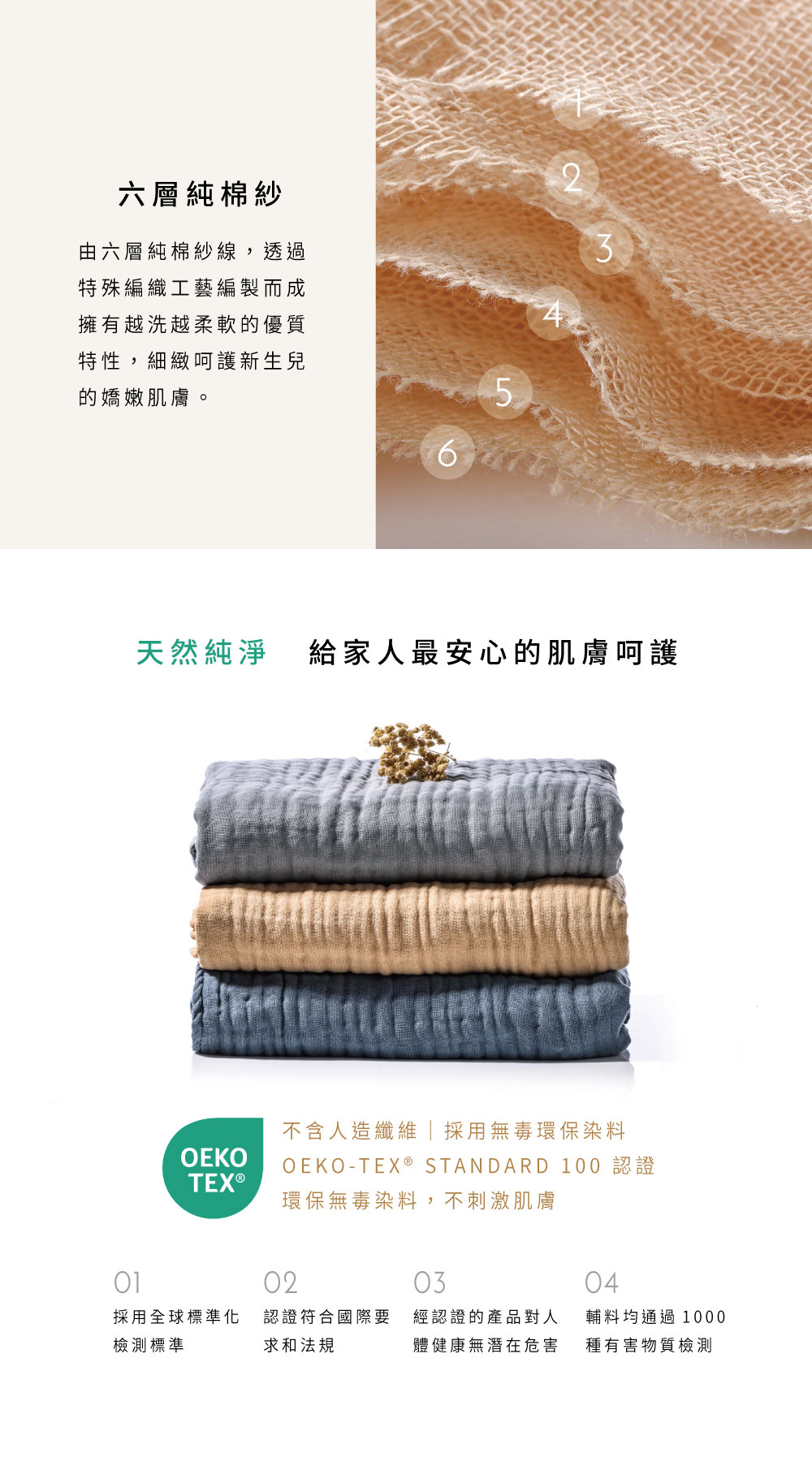 ‧ 六層棉紗-由六層純綿紗線織成,形成多重空氣隔層,洗滌後觸感更加柔軟