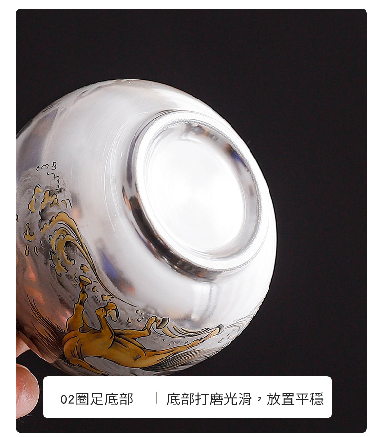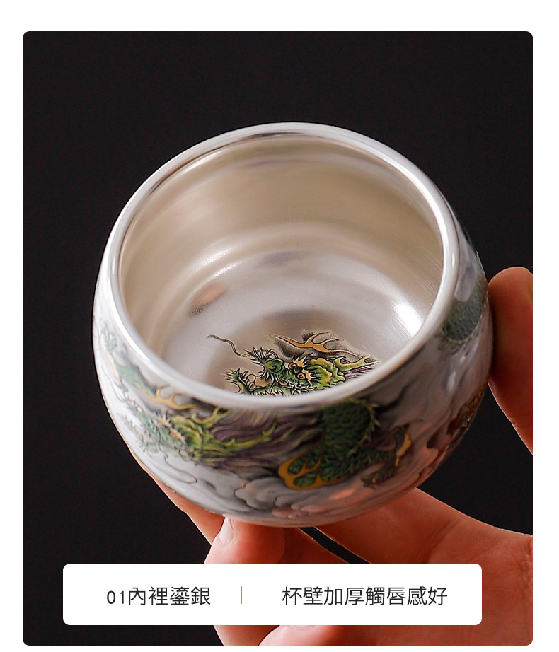 內壁純銀感: 杯內採用鎏銀工藝,銀白光亮。銀離子具備特殊的物理特性,能讓茶湯更顯順滑、綿長,提升品茗感受。