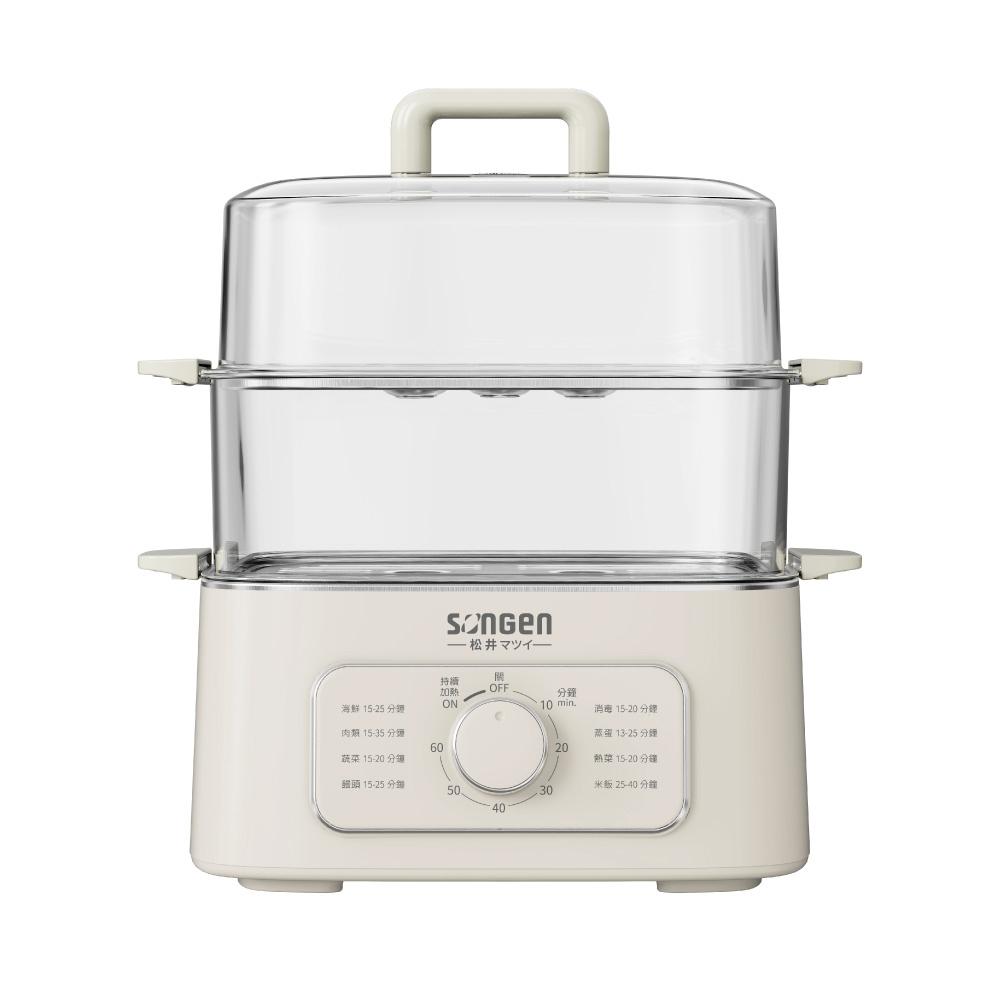 商品特色蒸/煮兩用,多功能烹煮 304不繡鋼內膽,好清潔不費力 蒸格可拆卸,單層/雙層隨意組合 可同時上蒸下煮,省時便利 60分鐘自由定時,不用看管 防乾燒自動斷電,安全有保障商品規格商品品牌:SONGEN松井 商品型號:SG-1011MS商品名稱:多功能雙層蒸煮鍋 商品尺寸:282X264X305mm 商品重量:1.8kg(含配件2.5kg) 容 量:總容量9.3L(蒸籠單層 3.5LX2層、內鍋 2.3L/水位1.7L) 額定電壓:AC110V / 60Hz 消耗功率: 1000 W 材 質:內鍋:食品級#304不鏽鋼、蒸盤:食品級#430不鏽鋼 產品保證:明台產物保險2000萬產品責任險 BSMI:R73998