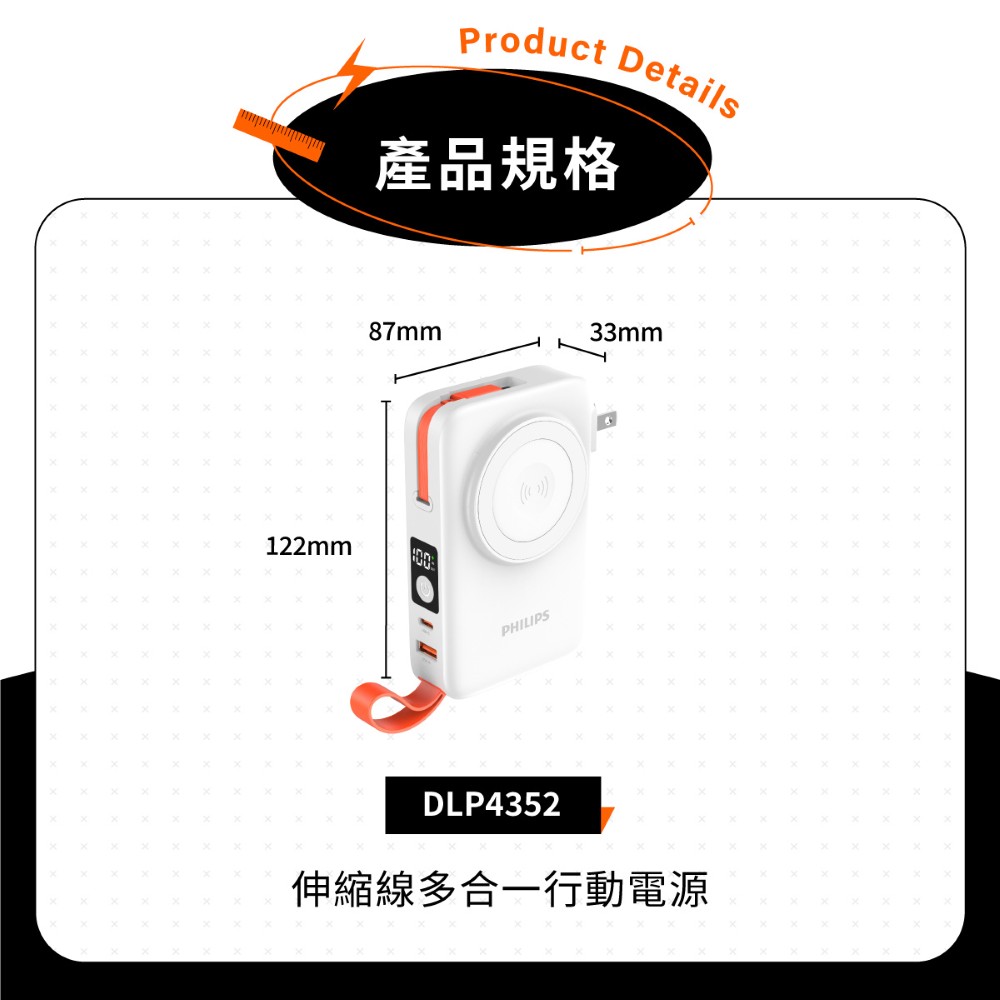 |行動電源 產品名稱:伸縮線多合一行動電源|行動電源 產品型號:DLP4352C|行動電源 產品顏色:完美白/百搭黑|行動電源 產品重量:304g|行動電源 產品尺寸:87 x 33 x 122 mm|行動電源 電芯容量:10000mAh@3.7V(37Wh)|行動電源 電芯容量: 6450mAh@5V;3500mAh@9V;3000mAh@10V;2600mAh@12V|行動電源 輸 入: AC輸入:100-240V,50/60Hz,0.3A Max USB-C孔或線輸入:5V3A,9V2.22A,12V/1.67A (Max ∴20W)|行動電源 AC模式輸出: USB-C孔輸出:5V/3A,9V/2.22A,12V/1.67A (Max∴20W) USB-A孔輸出:5V/3A,9V/2A,10V/2.25A,12V/1.5A (Max∴20W) USB-C線輸出:5V/3A,9V/2.22A,12V/1.67A (Max∴20W) 手機無線輸出:15W 耳機無線輸出:5W 手錶無線輸出:2.5W|行動電源 行動電源模式輸出: USB-C孔輸出:5V/3A,9V/2.22A,12V/1.67A (Max∴20W) USB-A孔輸出:5V/3A,9V/2A,10V/2.25A,12V/1.5A (Max∴22.5W) USB-C線輸出:5V/3A,9V/2.22A,12V/1.67A (Max∴20W) 手機無線輸出:5W,7.5W,10W,15W 耳機無線輸出:5W 手錶無線輸出:2.5W 同時總輸出(USB-C+USB-C Cable+USB-A):15W Max