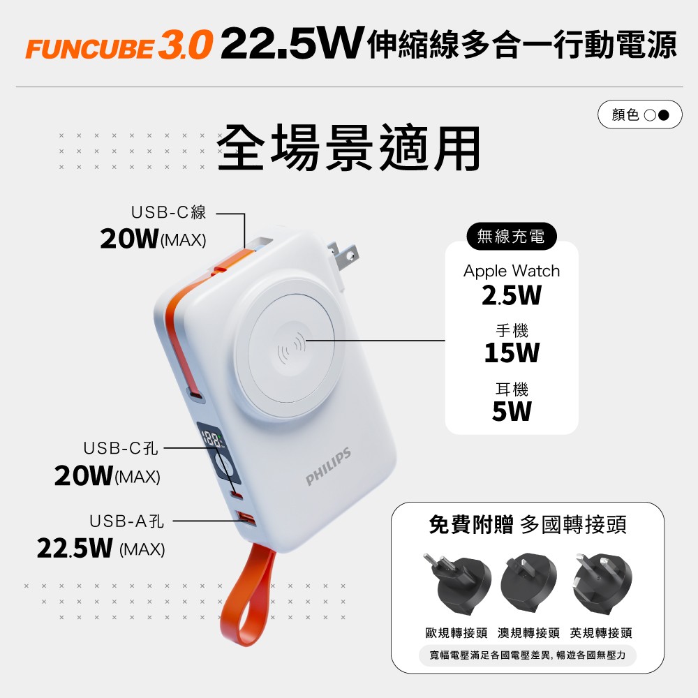 ✦飛利浦行動電源推薦,品質國際認證✦內含70cm Type-C 伸縮線✦22.5W伸縮多合一,全場景適用✦免費附贈多國轉接頭,全球通用✦技術規格領先全面進化,最放心的行動電源✦獨家控溫晶片,安全防護層層把關✦一米高抗摔測試,九道保護機制✦邊用邊充精彩不錯過,遊戲追劇好夥伴✦筆電、平板、相機都可以充,創作者救星✦全品項行動電源皆有Wh標示,安全標準ALL Pass✦BSMI許可字號:R39017✦NCC許可字號:CCAP25LP4680T0