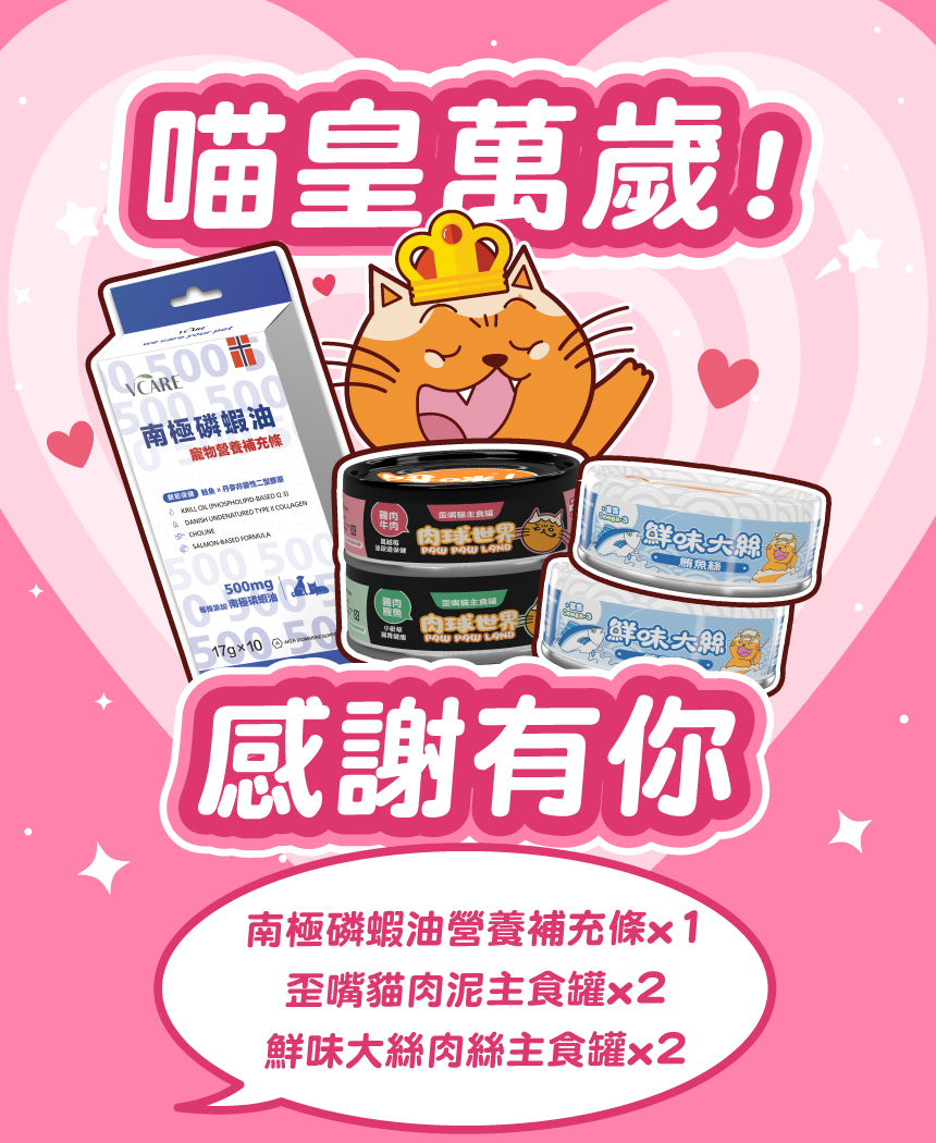 喵皇萬歲!感謝禮 歪嘴貓主食罐x2+鮮味大絲x2+南極磷蝦營養補充條x1盒