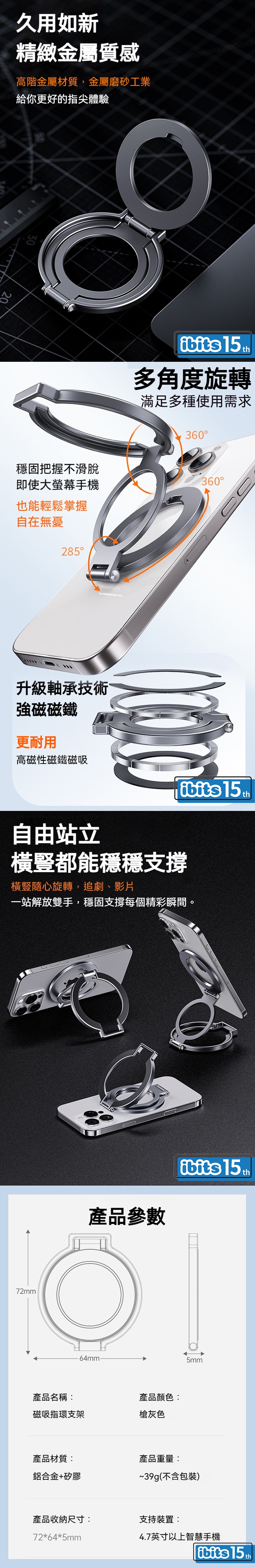 自由站立 橫豎都能穩穩支撐橫豎隨心旋轉,追劇、影片,一站解放雙手,穩固支撐每個精彩瞬間。-----------------------------------------產品參數名稱:磁吸指環支架顏色:槍灰色材質:鋁合金+矽膠重量:~39g(不含包裝)收納尺寸:72*64*5mm支持裝置:4.7英寸以上智慧手機