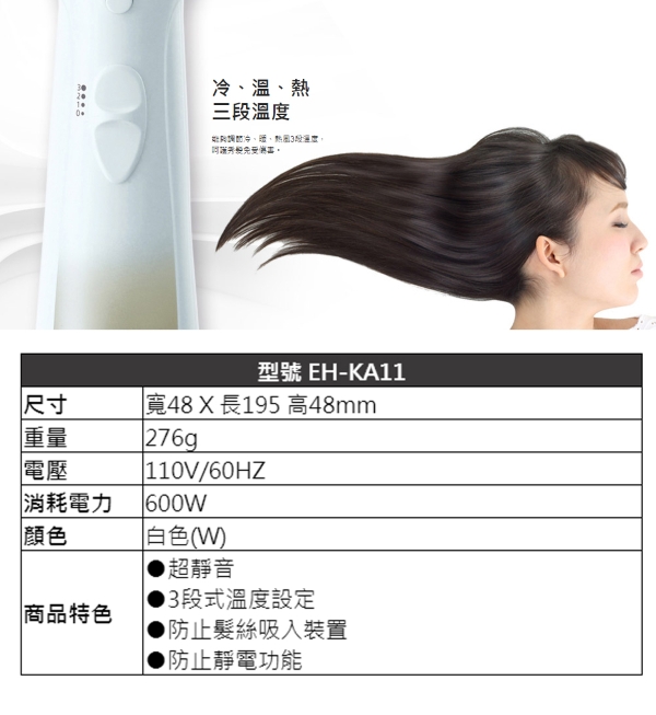 型號:EH-KA11顏色:白色商品尺寸:48(寬)x195(長)x48(高)mm商品重量:276g電源規格:110V/60Hz消耗功率:600WBSMI:R31417保固:1年產地:泰國