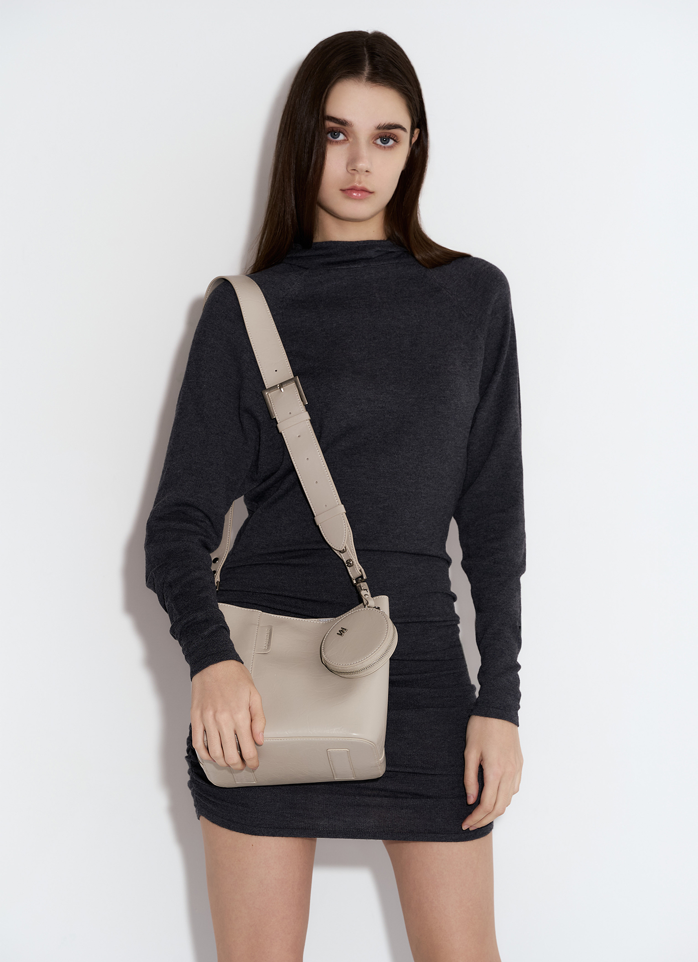 可放置長夾、6.7吋手機✔️精緻輕奢的水桶包輪廓,極簡風格適合日常使用特殊皮革壓紋外觀結合低調又不失質感的品牌標誌寬敞的收納空間,為你裝載外出所需的物品背帶使用可拆式設計,寬版造型分擔肩頸壓力附贈零錢包吊飾(9*2*9cm)