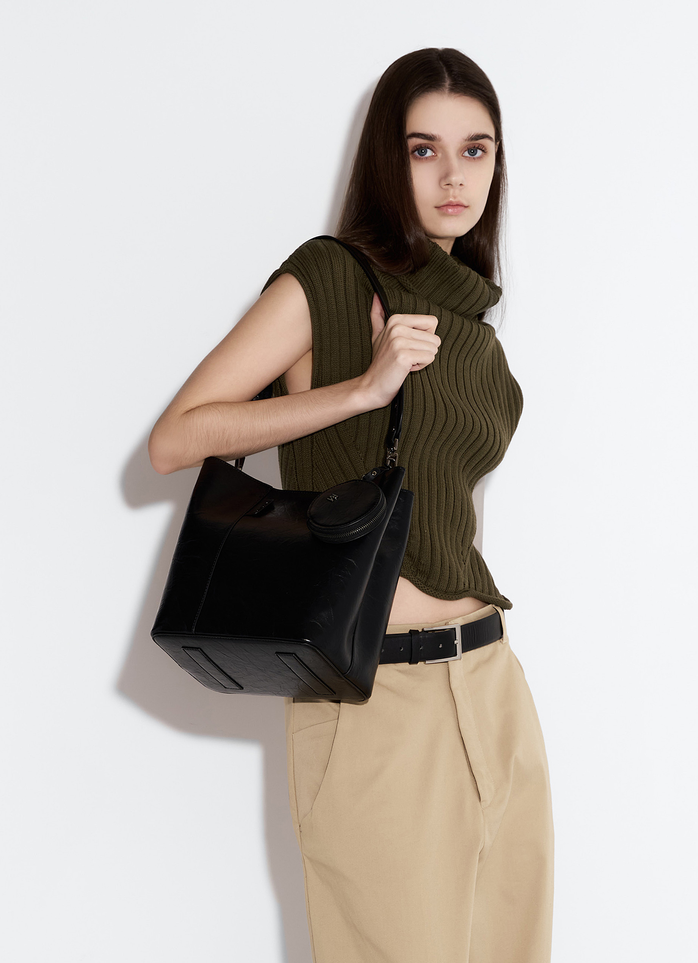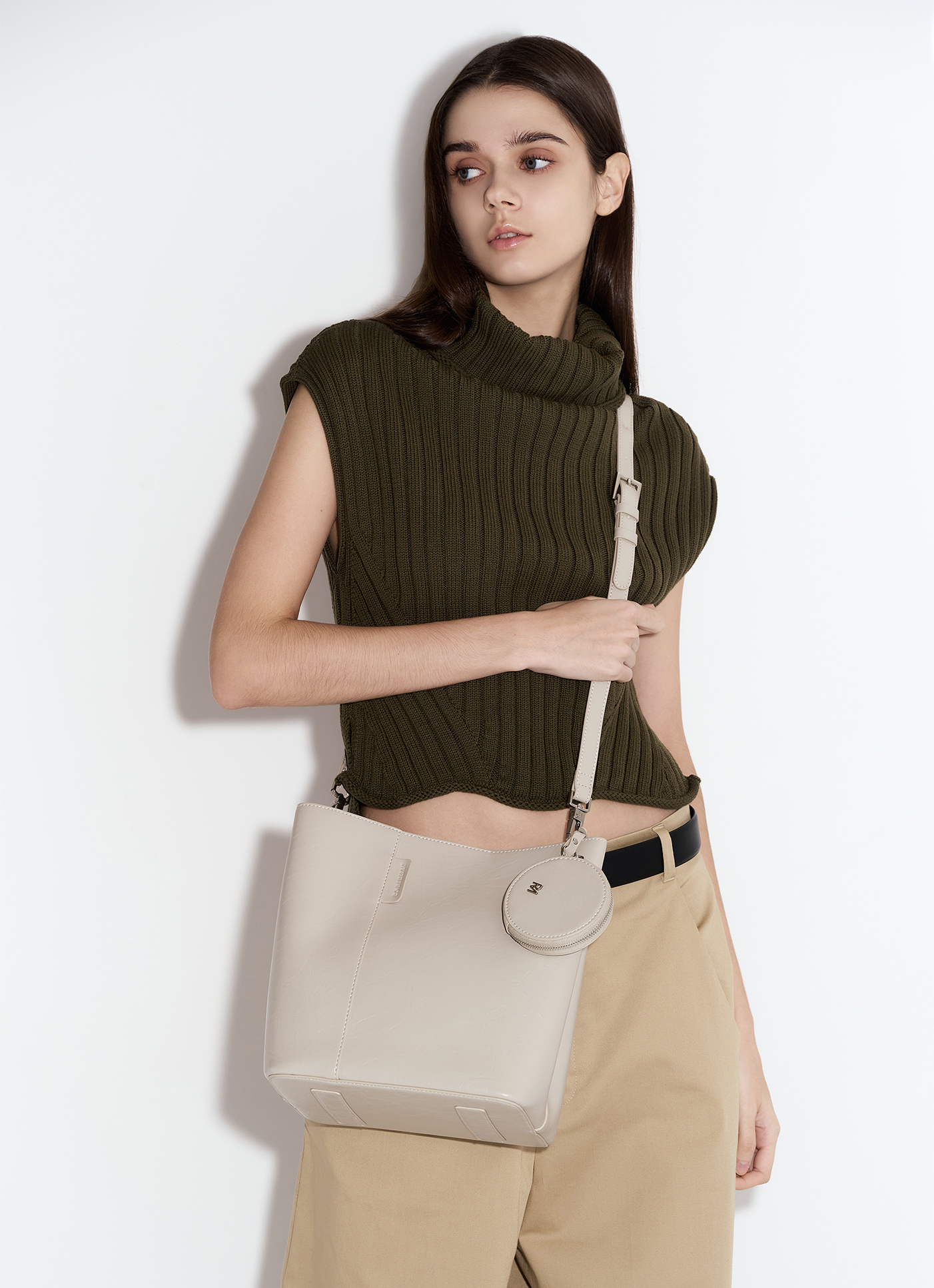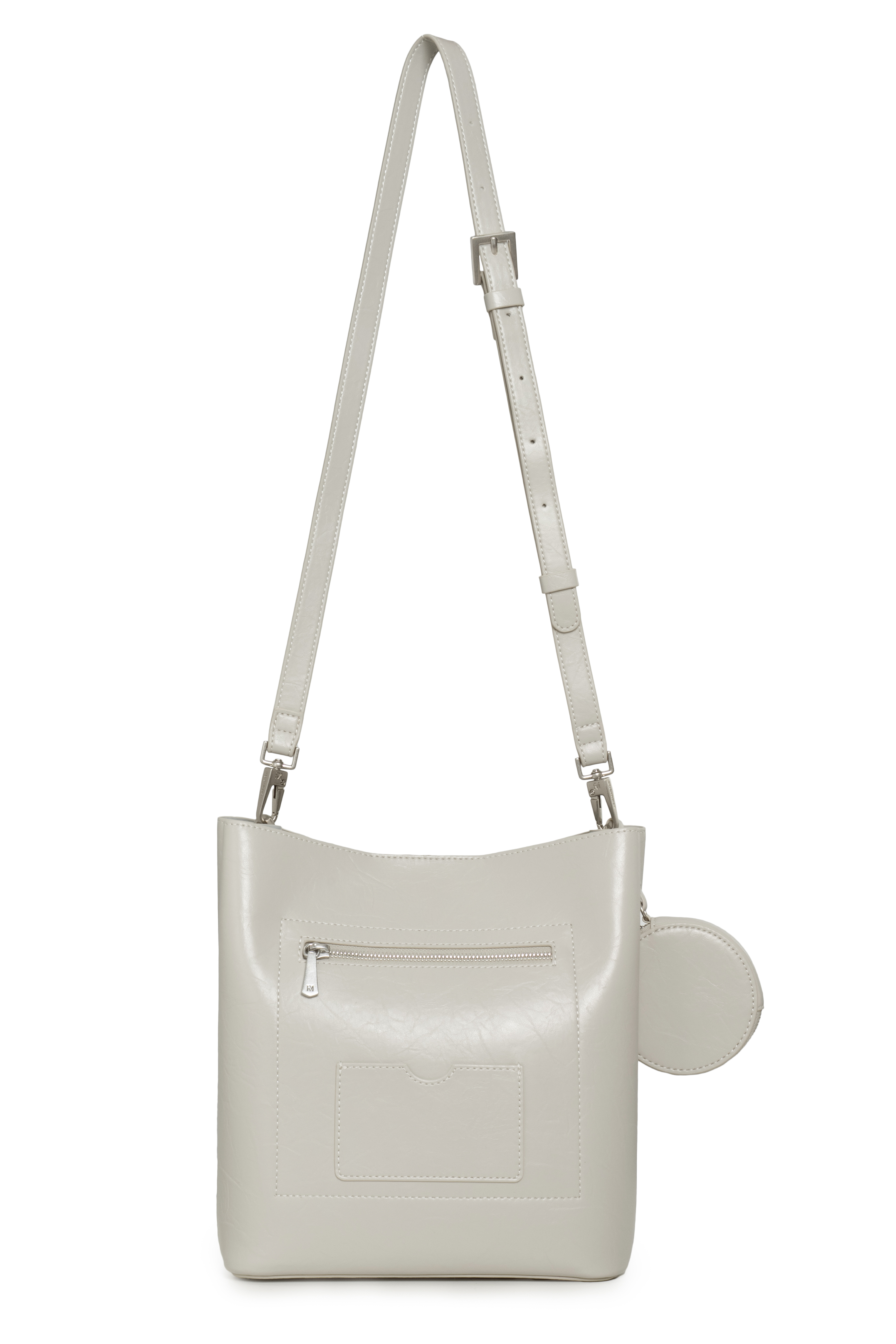 可放置長夾、6.7吋手機✔️大容量休閒水桶包輪廓,輕奢極簡風格適合日常使用特殊皮革壓紋外觀結合低調又不失質感的品牌標誌大型收納空間,隨心裝載外出隨身物品提供雙背帶,可自由隨穿搭變化肩背、斜背附贈零錢包吊飾(9*2*9cm)