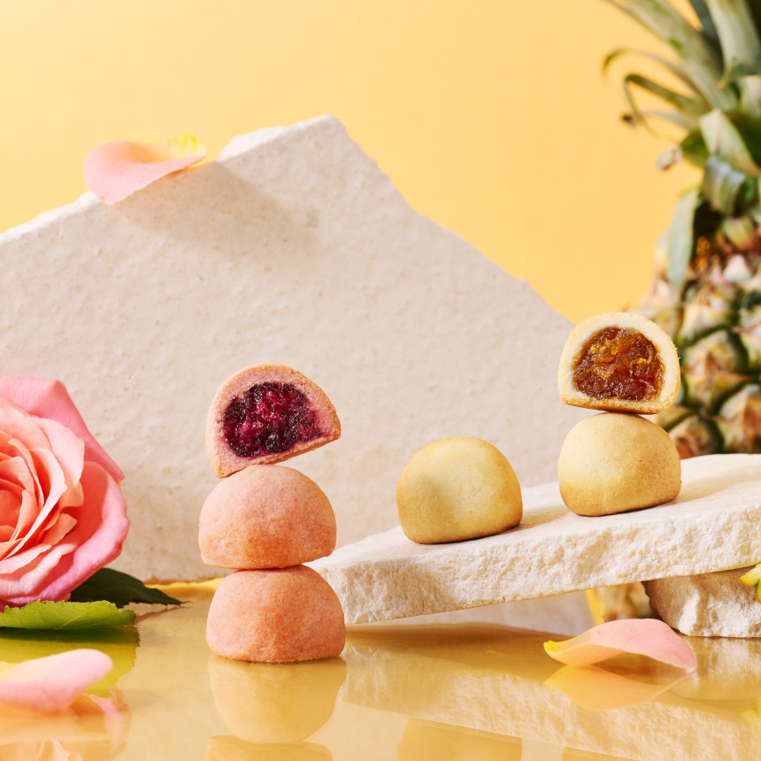 選用香氣豐富的法國格拉斯玫瑰與台灣紅寶石-洛神製成內餡,這是法式香調與台灣滋味的碰撞。