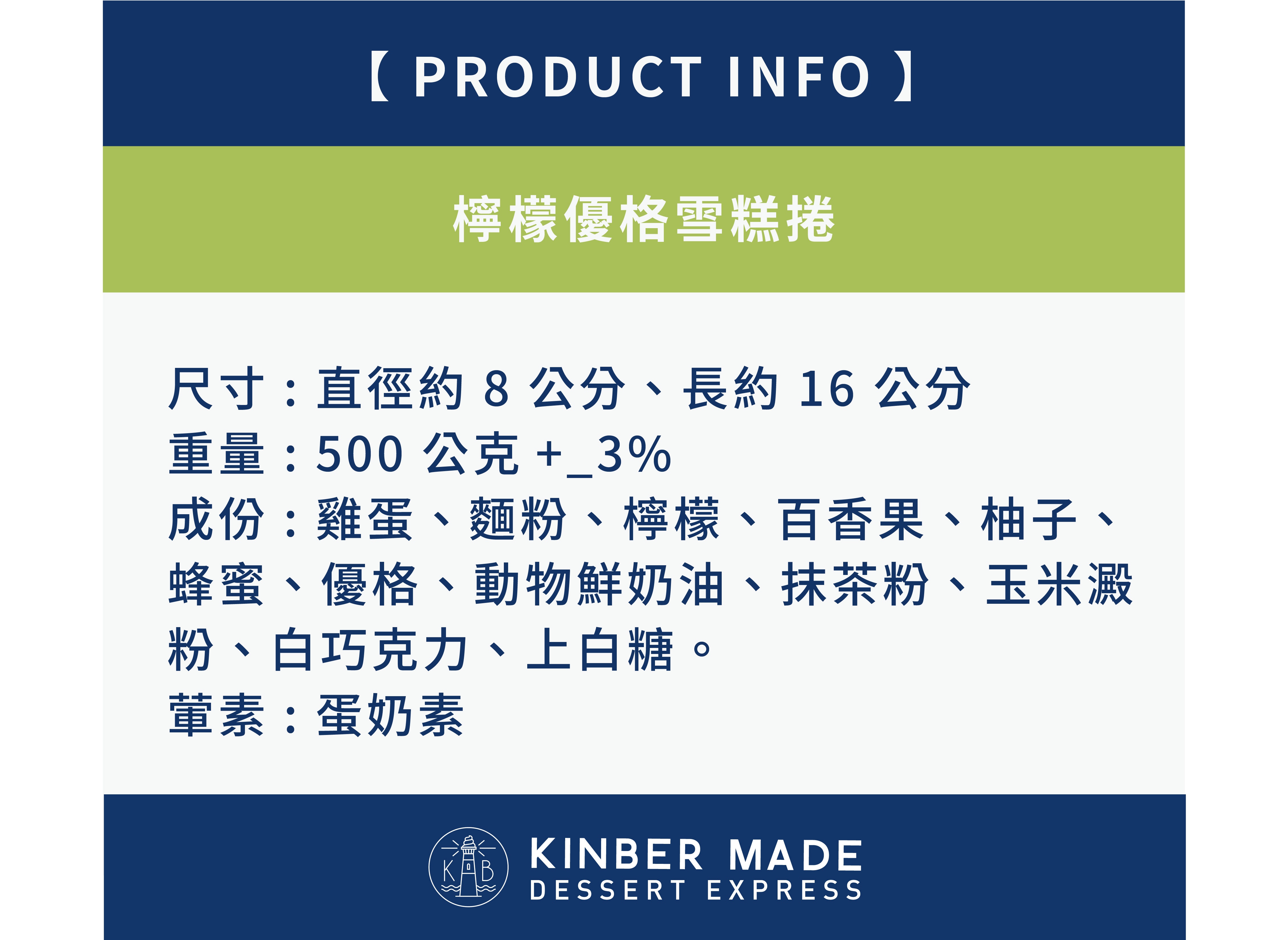成份:雞蛋、麵粉、檸檬、百香果、柚子、蜂蜜、優格、動物鮮奶油、抹茶粉、玉米澱粉、白巧克力、上白糖。尺寸:500 公克± 3% / 直徑約8公分、長約16公分保存方式:冷凍7天