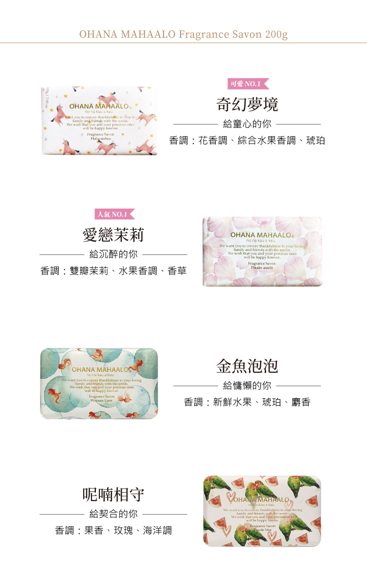名稱:OHANA MAHAALO 奇幻夢境 十分滿意禮物組 (經典禮物組+迷你隨行組)+絲柔手工皂香調:花香調、綜合水果香調、琥珀