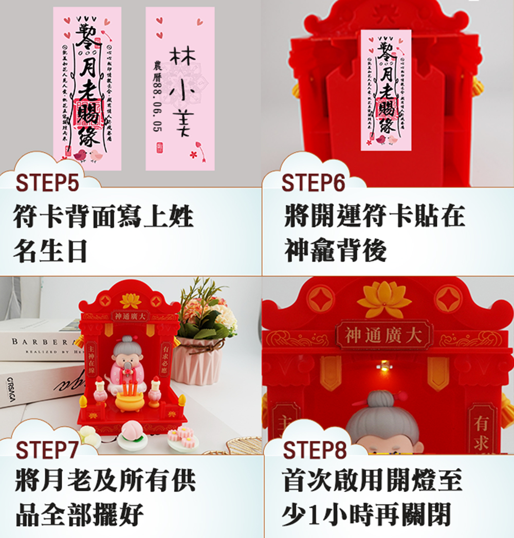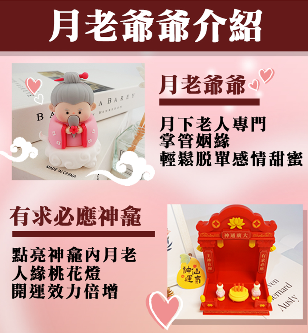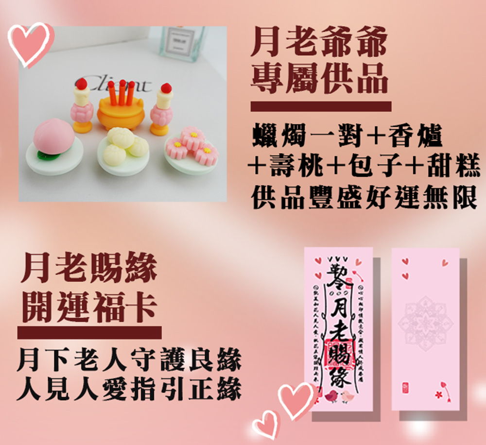 整組神龕還貼心準備了 月老的專屬供品──蠟燭、香爐、壽桃、包子與甜糕,寓意「添壽添喜、良緣圓滿、甜蜜長久」。開燈點亮神光=主神立刻上線,再搭配命運好好玩獨家的月老賜緣符卡,將生辰八字寫上貼於背面,專屬桃花加持能量瞬間 MAX!有月老爺爺坐鎮,你的愛情磁場全面打開,桃花不斷線,良緣不缺席,幸福緣分就此牢牢守住!