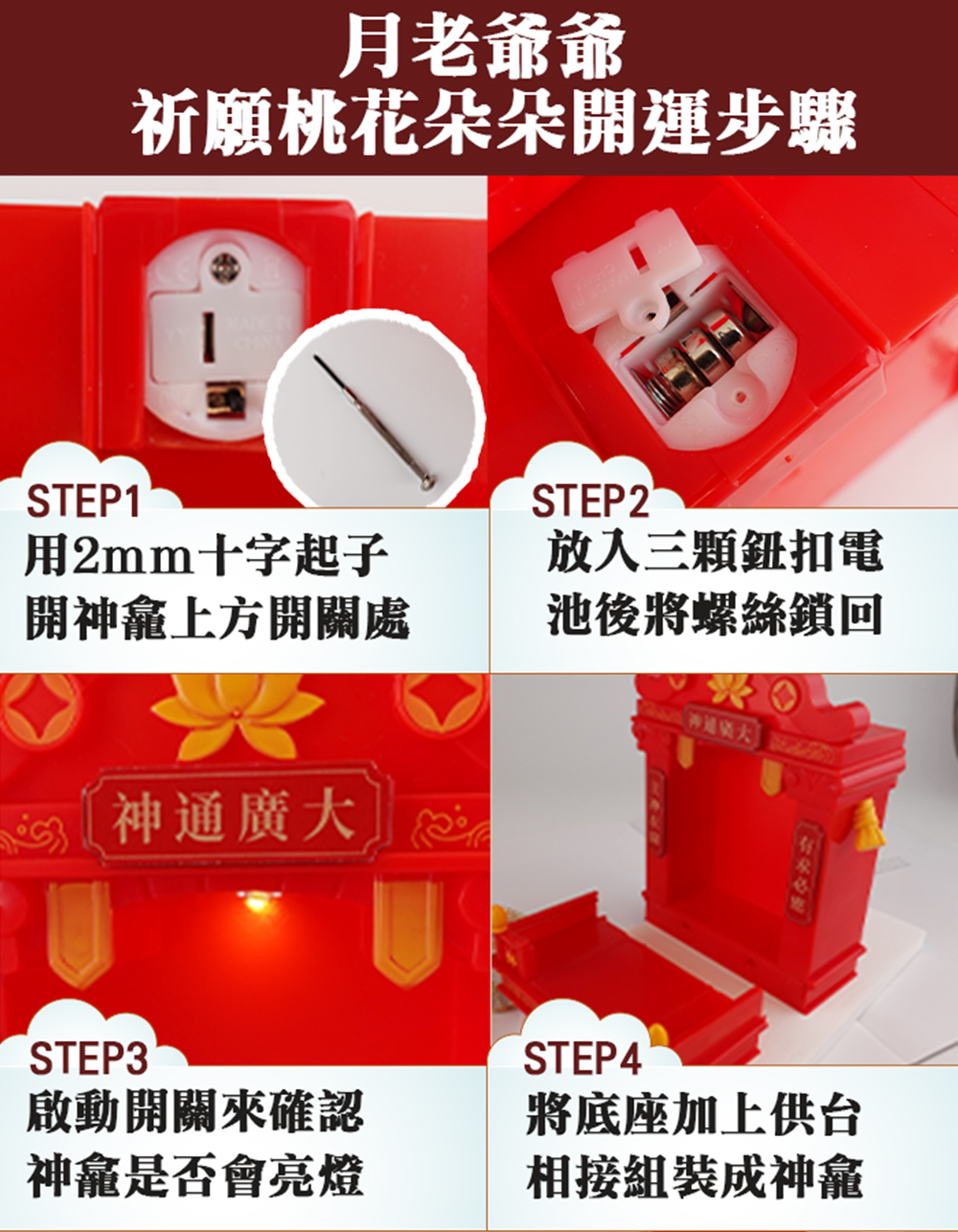 1. 用十字起子轉開開關放入三顆鈕扣電池點亮神龕
