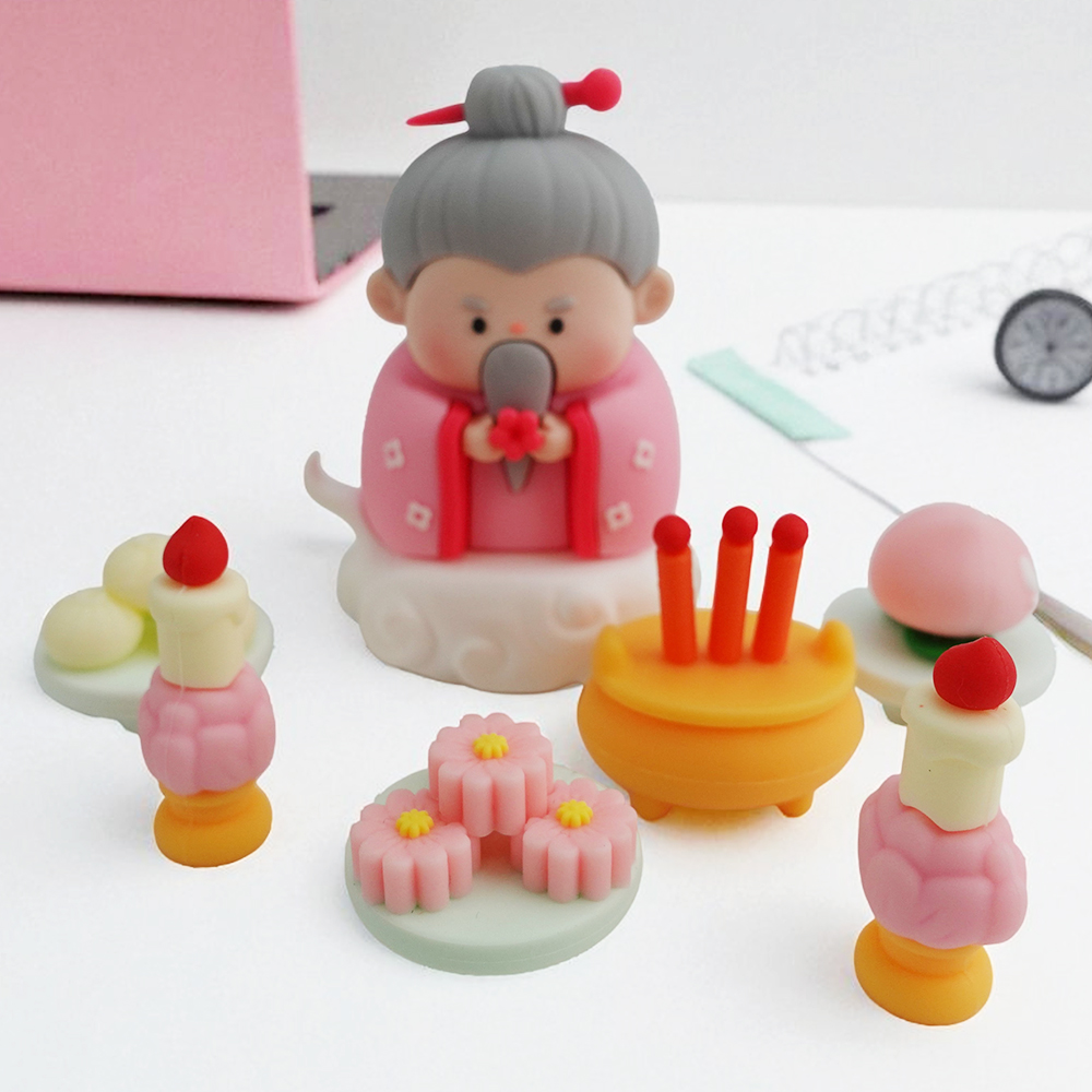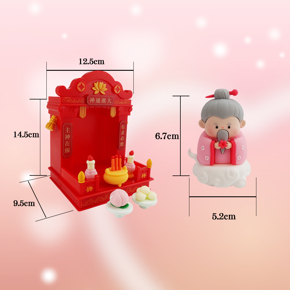 供品擺飾組x1組:軟膠PVC。蠟燭單支長約1.6cm寬約1.3cm高約3.5cm(附一對),香爐長約3cm寬約2.4cm高約3.5cm,包子直徑約2.6cm高約2.3cm,壽桃直徑約2.6cm, 甜糕整體直徑約2.6cm高約2.1cm,重量約5g。