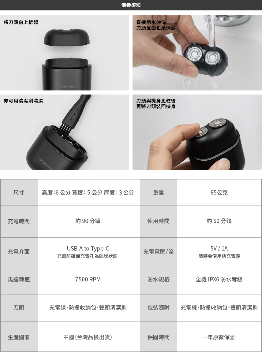 產品尺寸:6公分 x 5公分 x 3公分產品重量:85 公克充電時間:約 90 分鐘充電介面:USB to TypeC (充電前確保充電孔為乾燥狀態)使用時間:約 60 分鐘適用電壓:100V~240V充電電壓:5V1A (請避免使用快充電源)馬達轉數:7500RPM刀頭:浮動圓弧雙刀頭包裝隨附:充電線、防撞收納包、雙頭清潔刷生產國家:中國 ( 台灣品檢出貨)保固時間:一年原廠保固