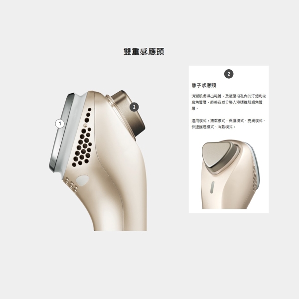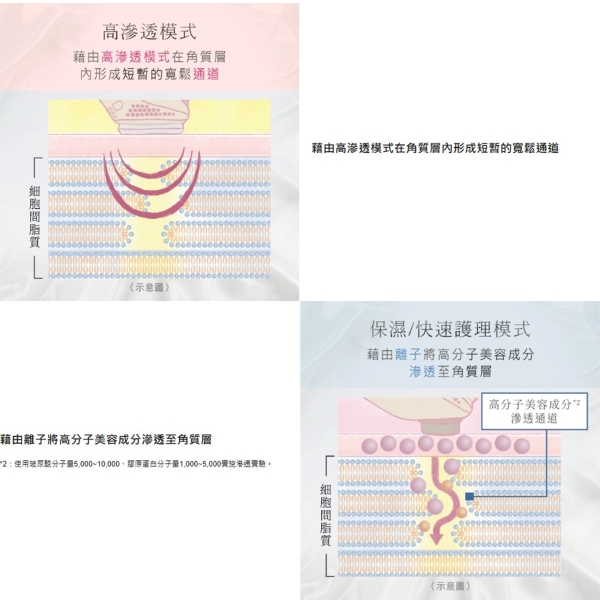 高分子美容成分深度滲透 - 搭載高分子滲透技術,將高分子美容成分玻尿酸5.7倍、膠原蛋白5.0倍滲透至肌膚角質層深處肌膚更水潤透亮 - 搭載保濕/亮膚/快速護理模式,將保濕成分、維他命C滲透至肌膚角質層緊緻肌膚 - 搭載冷敷模式,透過約10℃冷敷打造清爽緊實的肌膚高分子滲透技術 - 將難以滲透至肌膚角質層的高分子美容成分也能深度滲透,膠原蛋白5.0倍、玻尿酸5.7倍雙重感應頭 - 1.高滲透感應頭:提升皮膚角質層滲透,幫助保養品中的高分子美容成分,有效滲透肌底 2.離子感應頭:清潔肌膚、導出藏匿於毛孔中的污垢和老廢角質;將美容成分導入至肌膚角質層6種模式 - 清潔模式/高滲透模式/保濕模式/亮膚模式/快速護理模式/冷敷模式