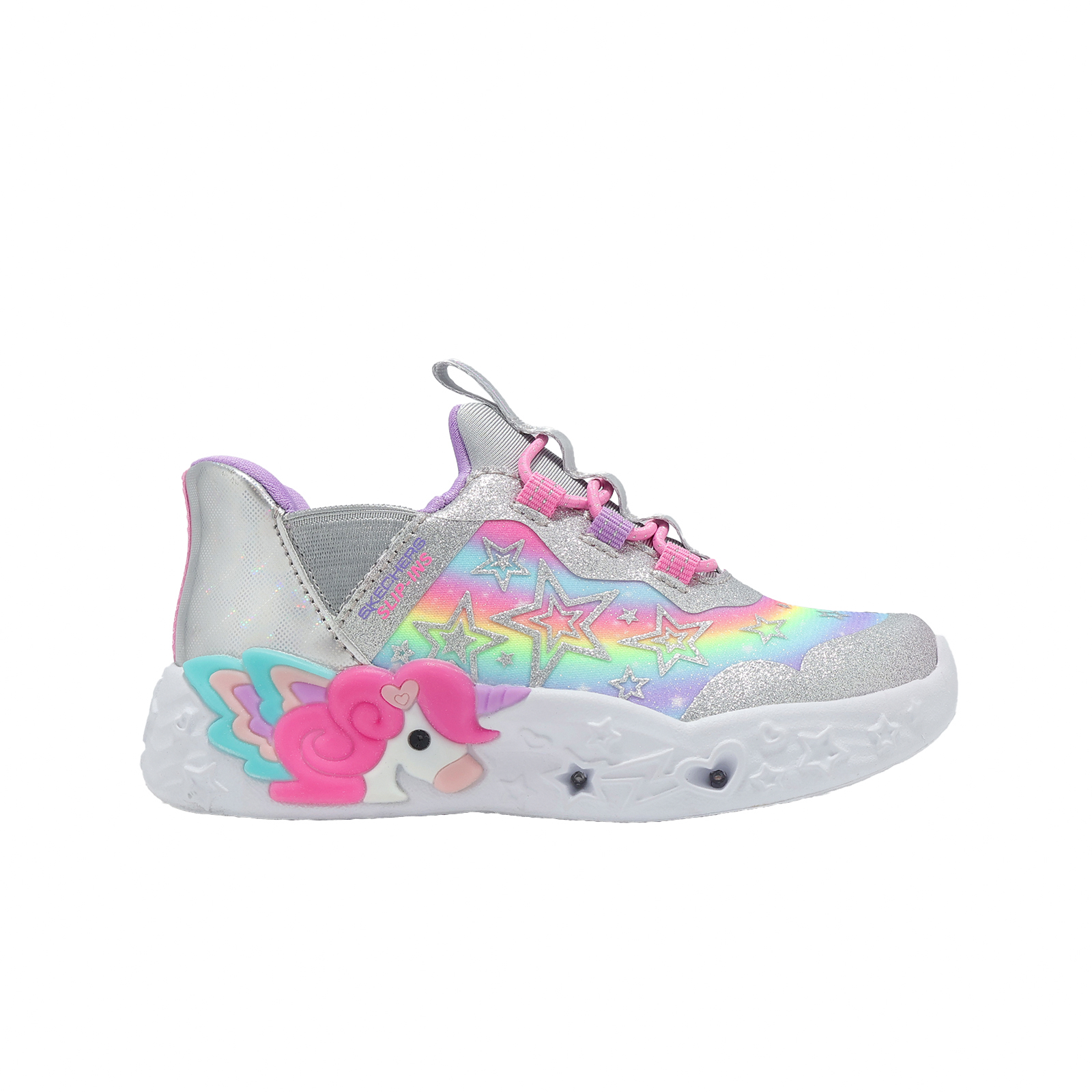 品牌: SKECHERS型號: 302297-NSMLT品名: S Lights-Unicorn Charmer Slip-Ins版型: 版型正常* S lights 燈鞋系列,輕量運動鞋,鞋面以銀色設計,是女孩們無法抵抗的夢幻絕美運動鞋。
