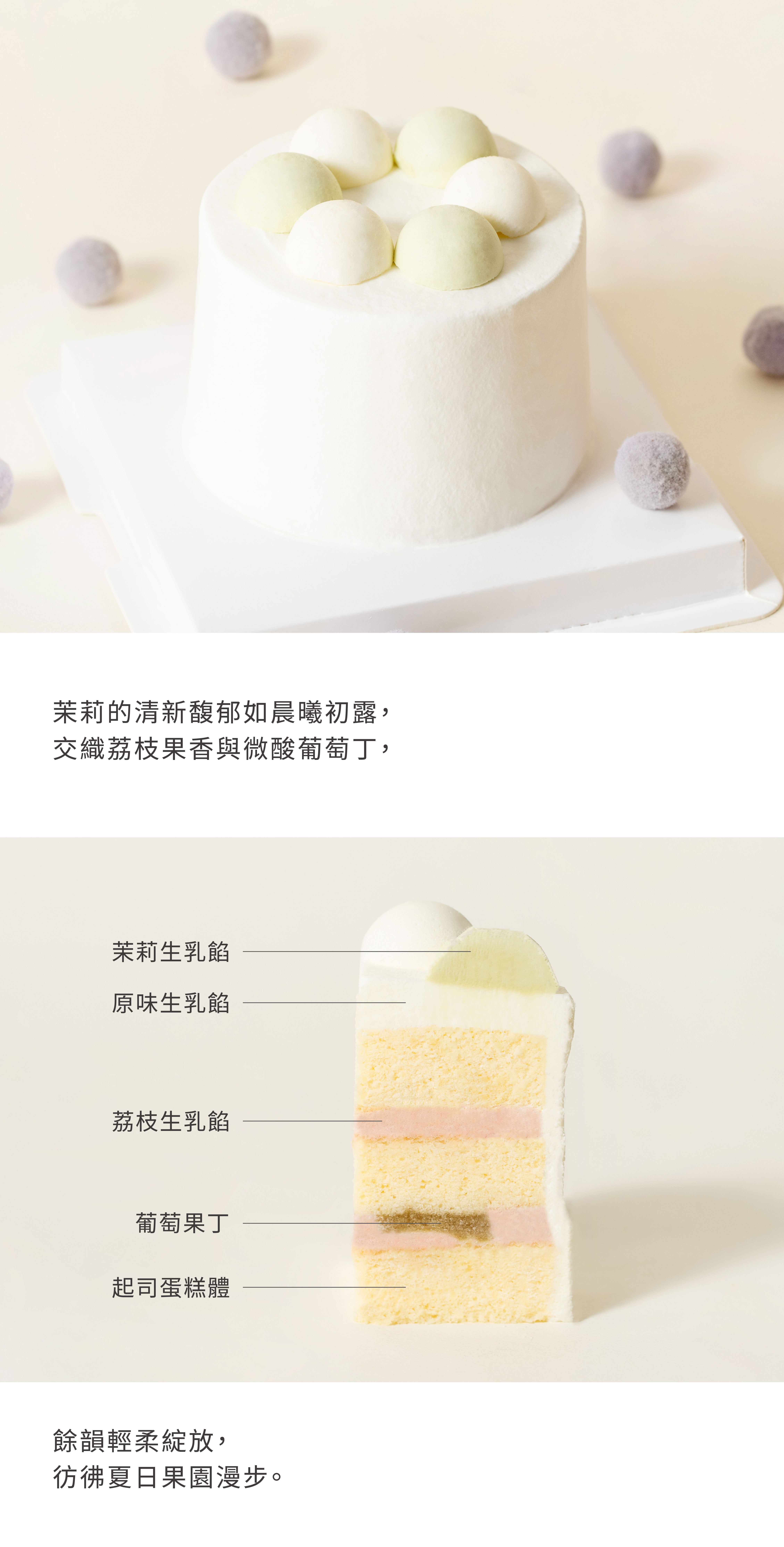 商品內容名稱:荔枝葡萄乳酪戚風蛋糕(3.5吋)貨號:322452737成份:雞蛋、低筋麵粉、大豆油、上白糖、動物鮮奶油、白巧克力、帕馬森起司粉、檸檬汁、荔枝果泥、覆盆子果泥、奶油、葡萄果肉。尺寸:220公克± 3% / 直徑約8公分保存方式:冷凍7天