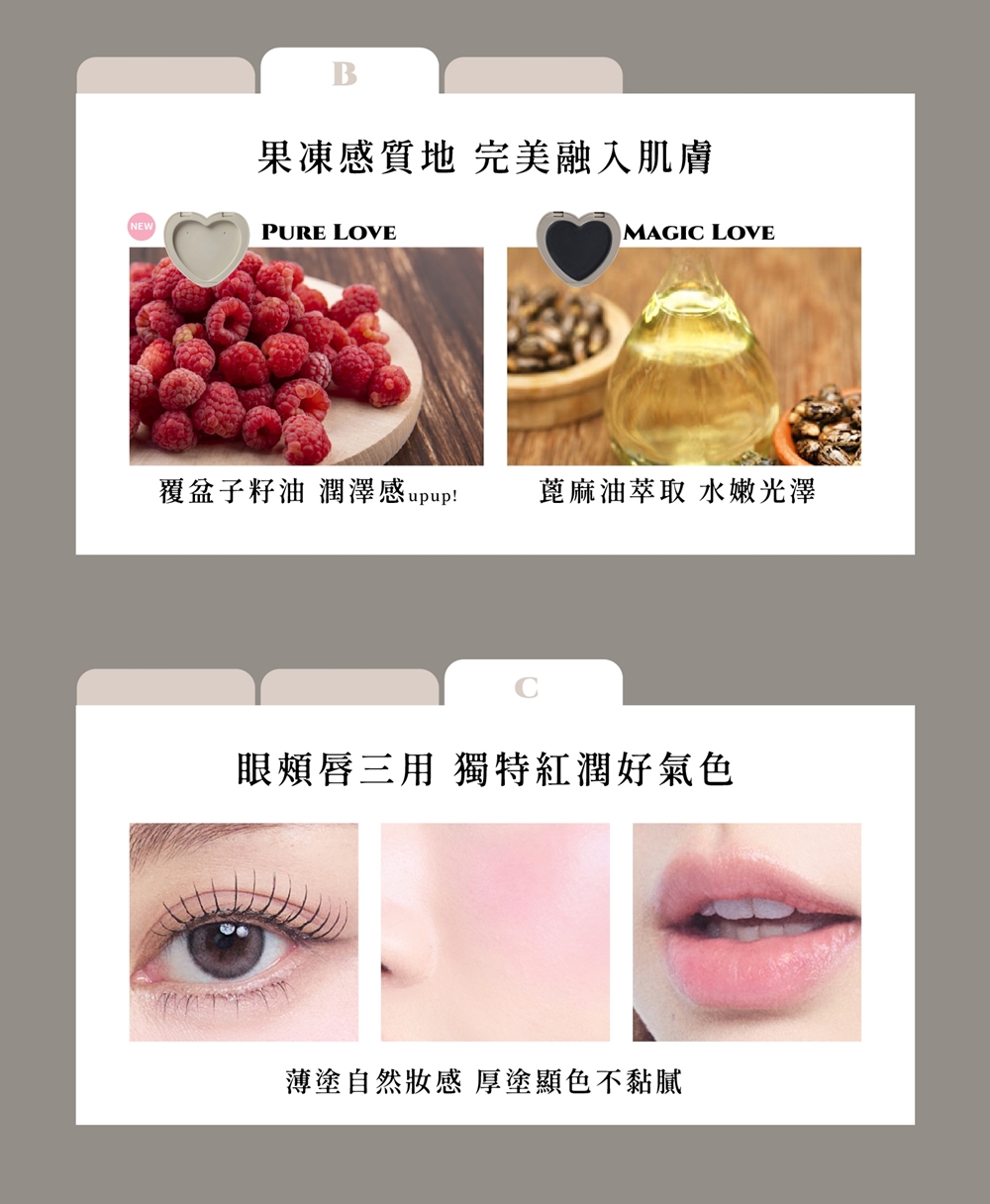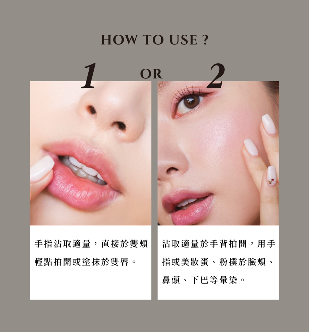 #眼頰唇三用,薄塗自然妝感,厚塗更顯色。