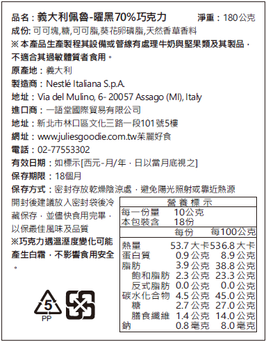 名稱 : 【CupiCho 丘彼巧】義大利佩魯-曜黑70%巧克力(袋裝)