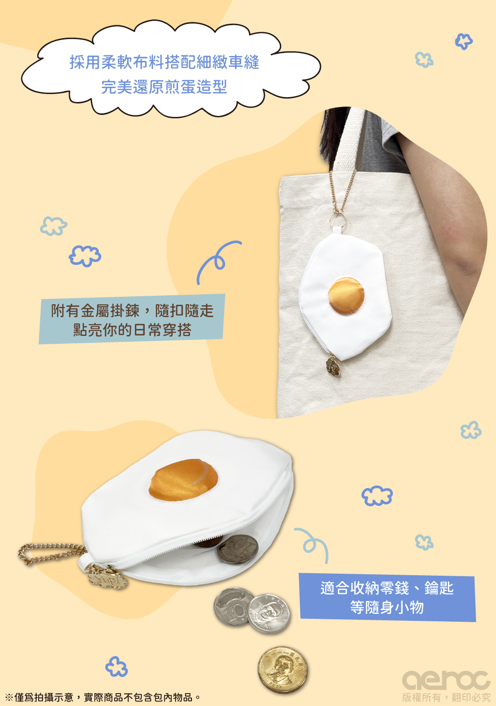 採用柔軟布料搭配細緻車縫,完美還原煎蛋造型附有金屬掛鍊,隨扣隨走,點亮你的日常穿搭適合收納零錢、鑰匙等隨身小物