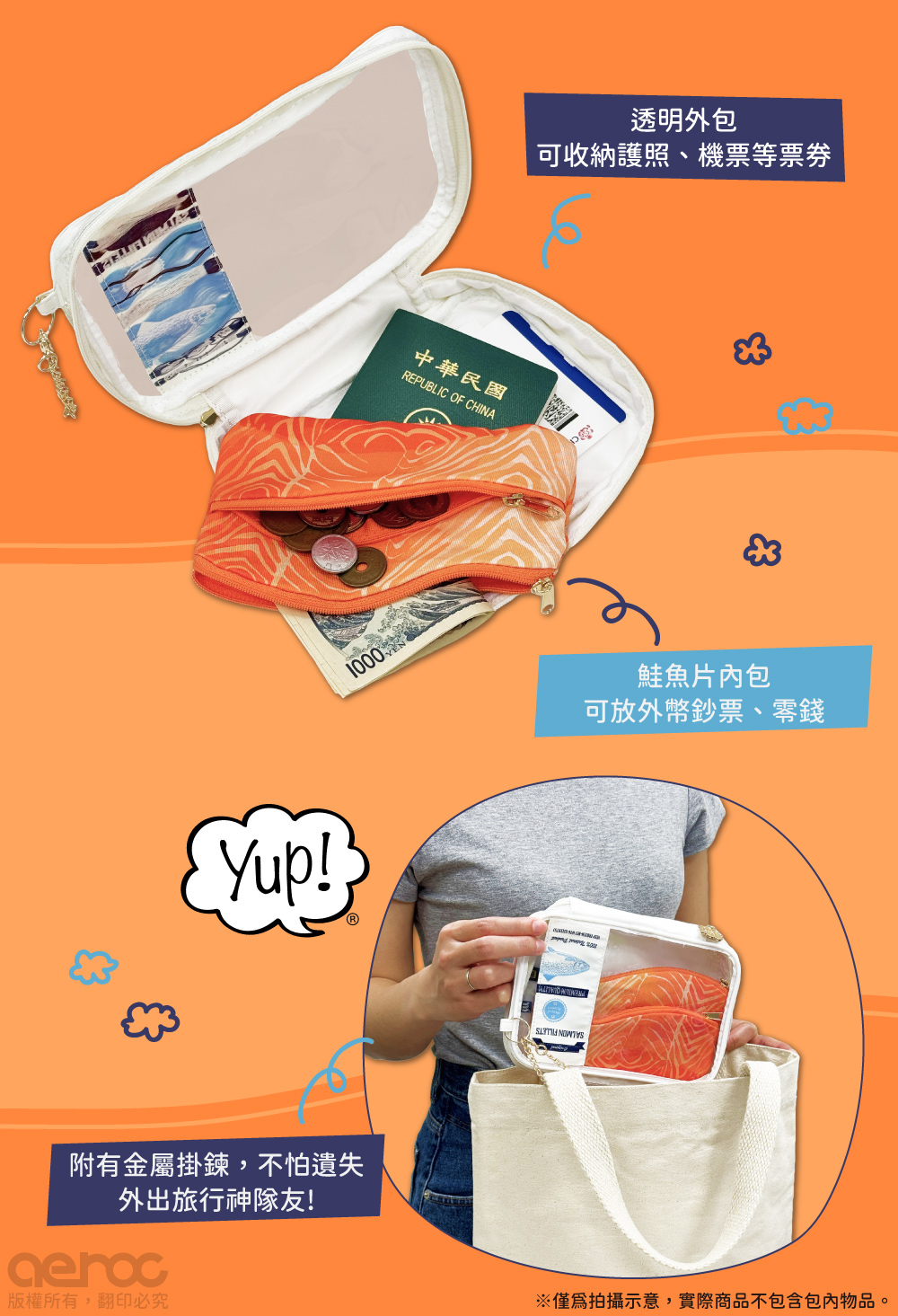 不用再擔心包包裡雜亂無章!「外殼透明包 + 內層印花包」的設計,讓收納更有邏輯!透明外包:可收納護照、機票等票券;鮭魚片內包:可放外幣鈔票、零錢附有金屬掛鍊,不怕遺失,外出旅行神隊友!