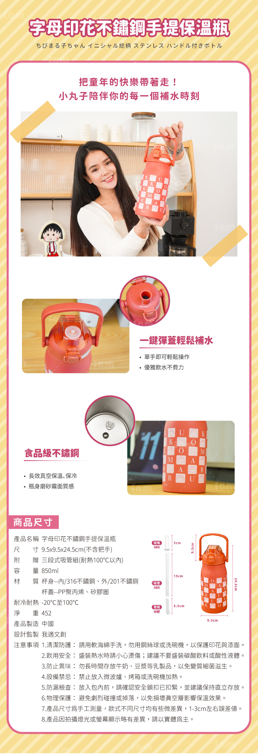 🌟台灣原創設計: 台灣設計師操刀,珍稀度滿分。經典聯名: 櫻桃小丸子字母印花,復古紅磨砂質感。一鍵彈蓋: 安全鎖扣設計,單手即可輕鬆飲水。便利手提: 寬大加厚提把,好握、好掛、好隨身。真空保溫: 食品級不鏽鋼內膽,長效保溫保冷。細膩防滑: 精緻噴砂工藝,不留指紋、抓握穩固。密封防漏: 內置矽膠密封圈,安心放入包包。