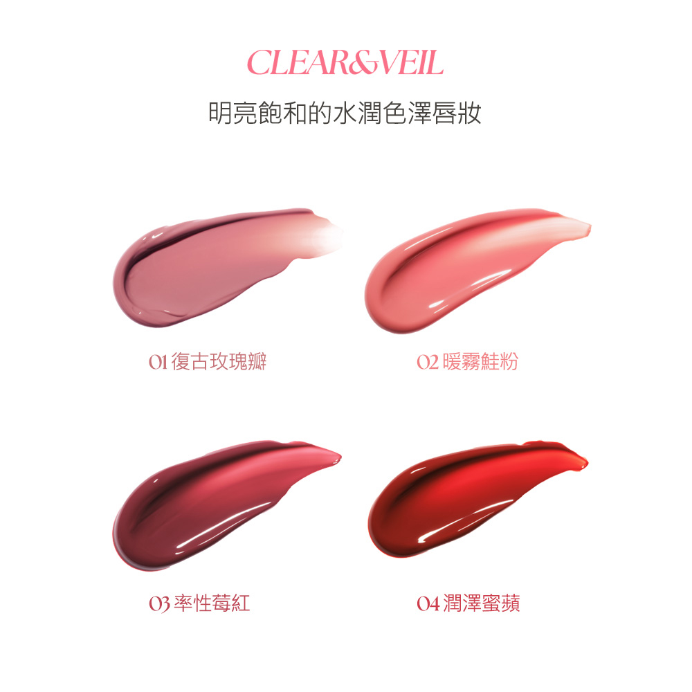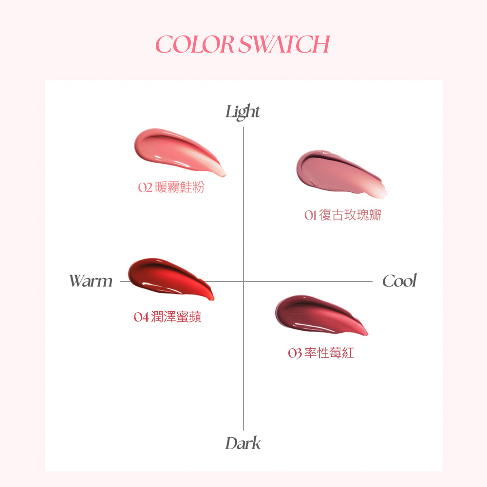 ▪️ 濃郁飽滿高顯色色澤,維持雙唇柔嫩水潤▪️ 上唇後形成清透水光膜,牢牢鎖住色澤與光澤度,▪️ 添加覆盆子油、蘋果籽油等多重水果精華,深層滋潤修護