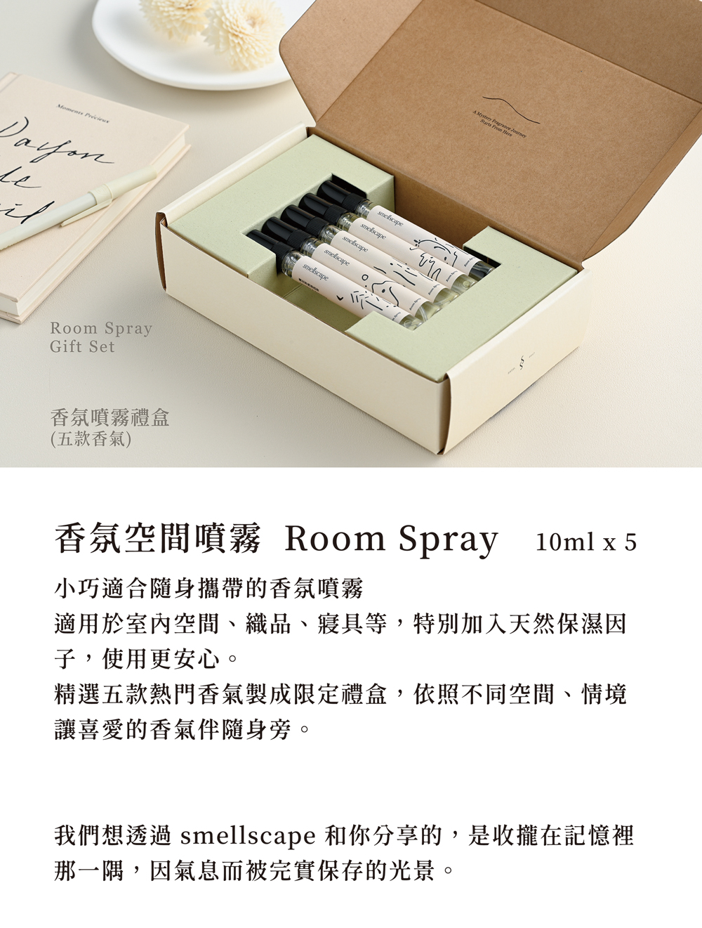 ◌ 品名: smellscape香氛噴霧禮盒(五入組)禮盒尺寸:21cm x 12cm x 5cm◌ 容量:10ml ± 5% x 5◌ 用途:天然溫和的空間噴霧,噴撒於空氣中、織品上,增添宜人香氣◌ 成分:專利無菌水、香水等級香氛、天然海藻保濕因子、天然抗氧化劑、甘油◌ 原料: 美國◌ 製造地: 台灣 (PIC/S GMP 合格工廠製造)