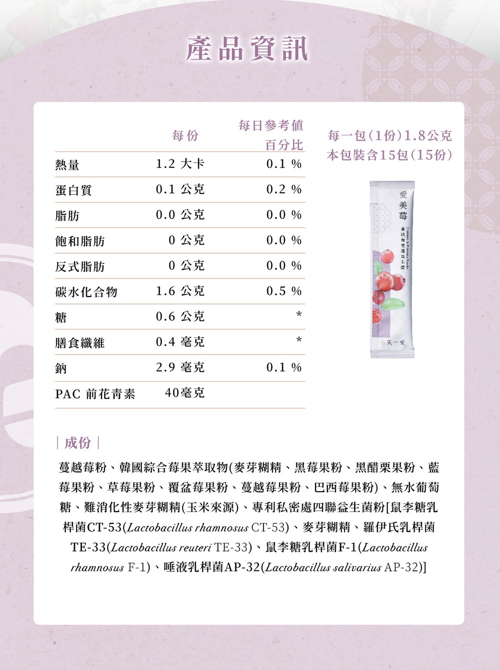 ▲ 私密益生菌添加,三大國際專利,無添加安心補給▲ 高濃度前花青素,成分升級▲ 每包精準配比益生菌與莓果萃取,日常補養好吸收▲ 一盒 15 包,建議每日使用 1–2 包▲ 經期後、產後、日常呵護皆適用,溫柔守護女性自信