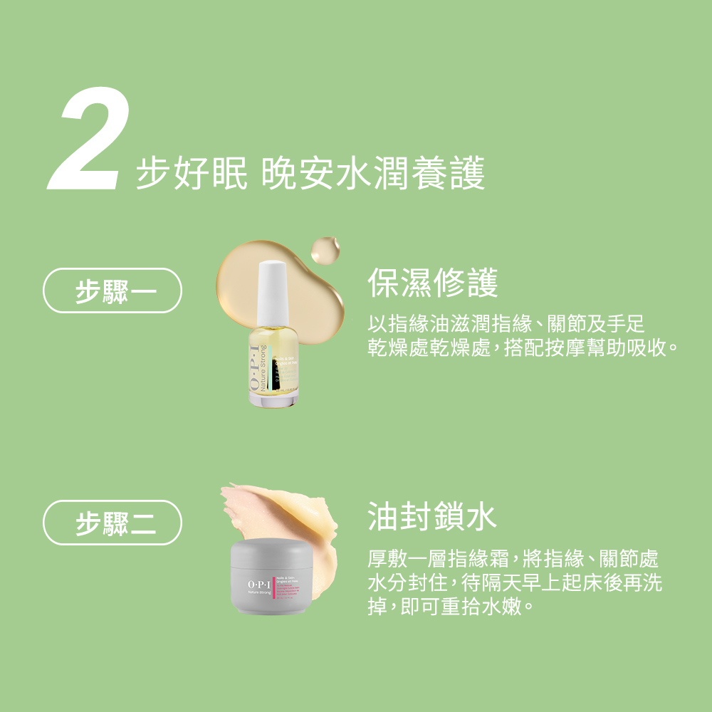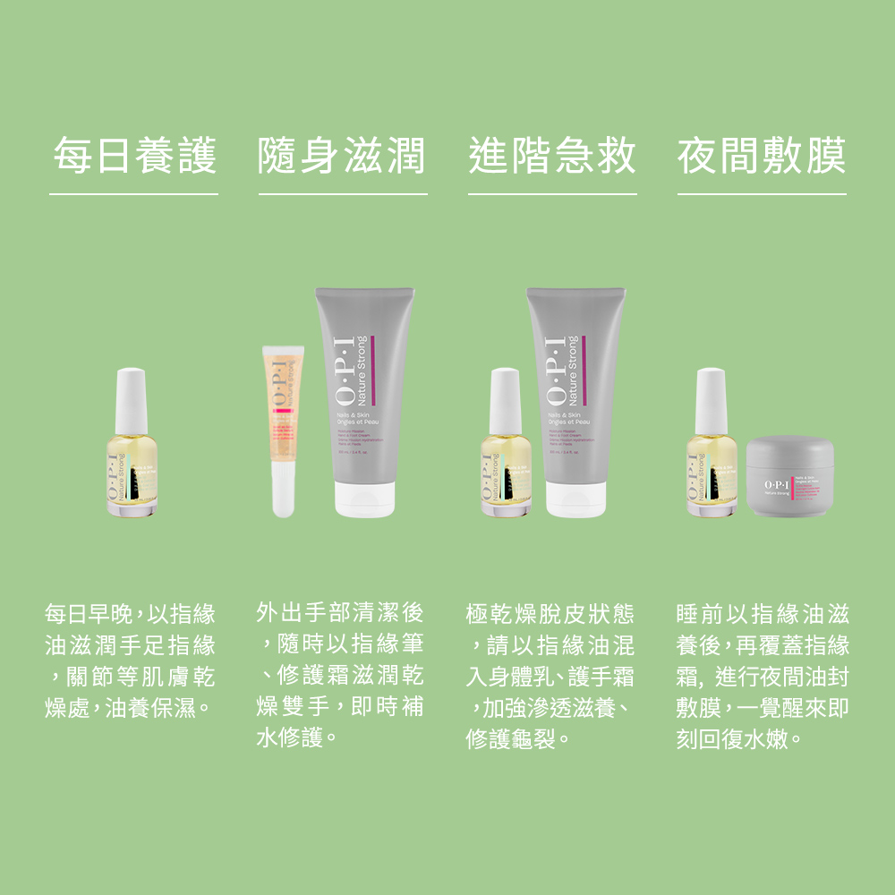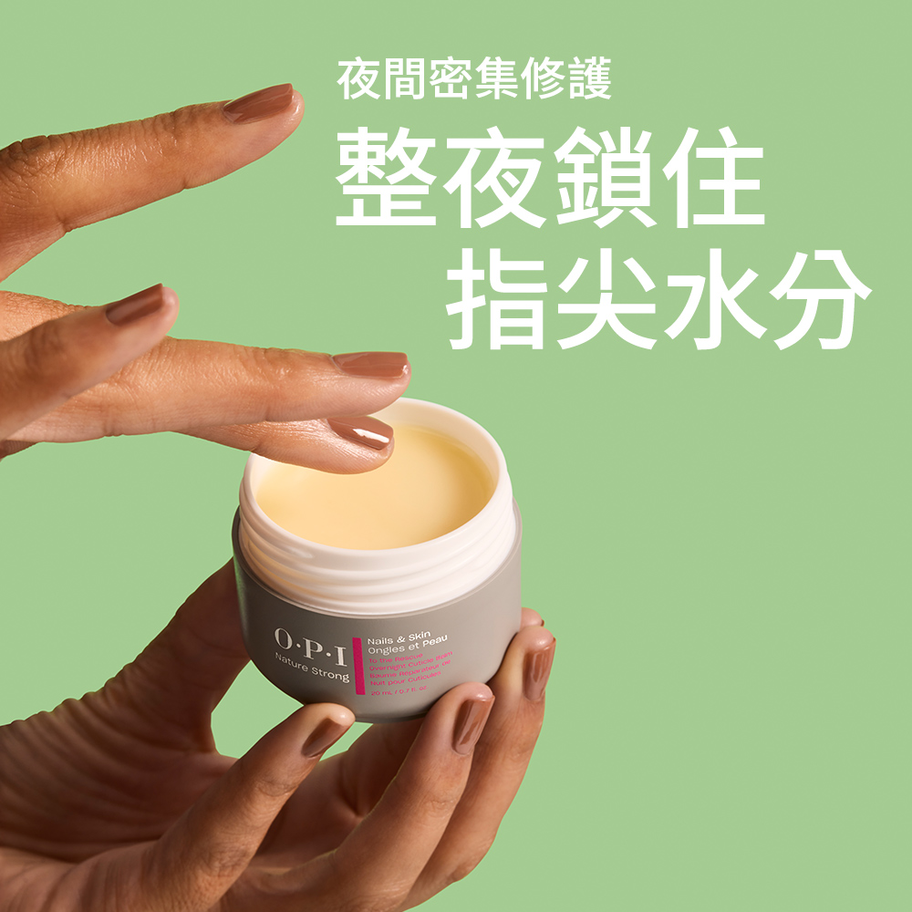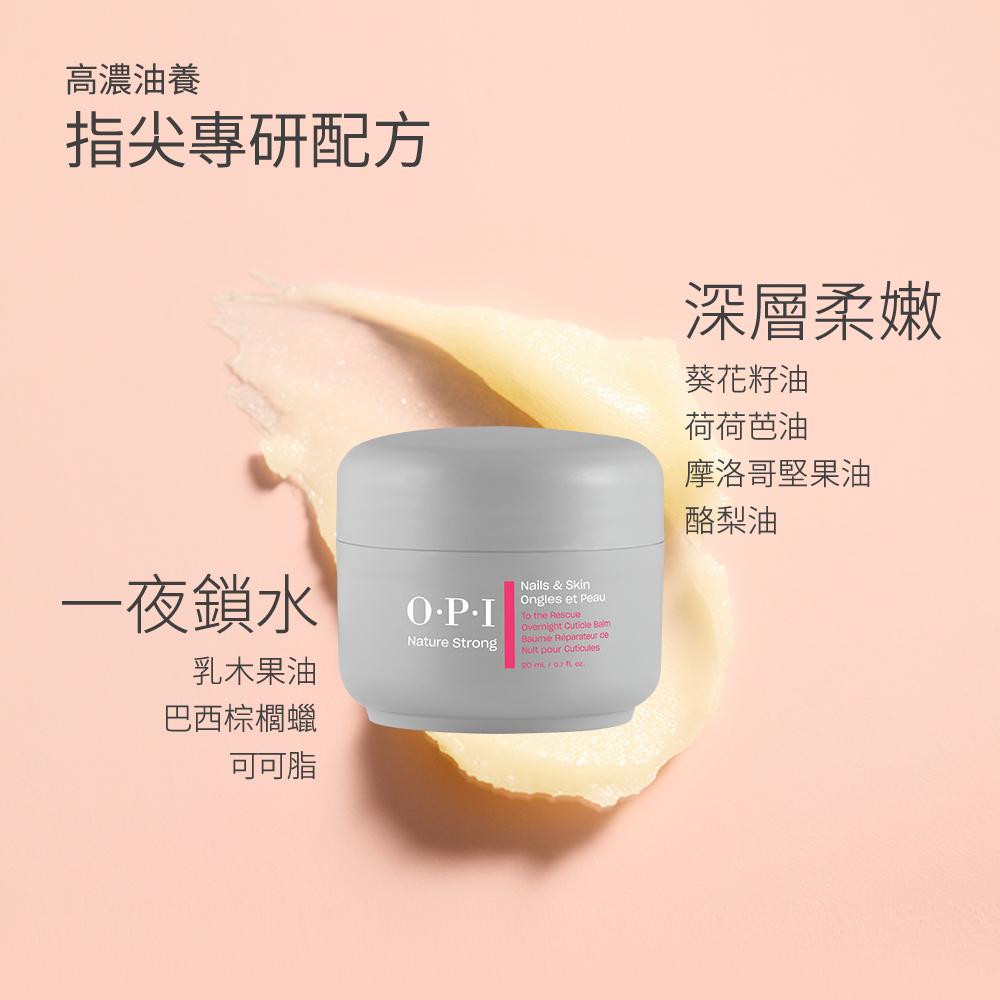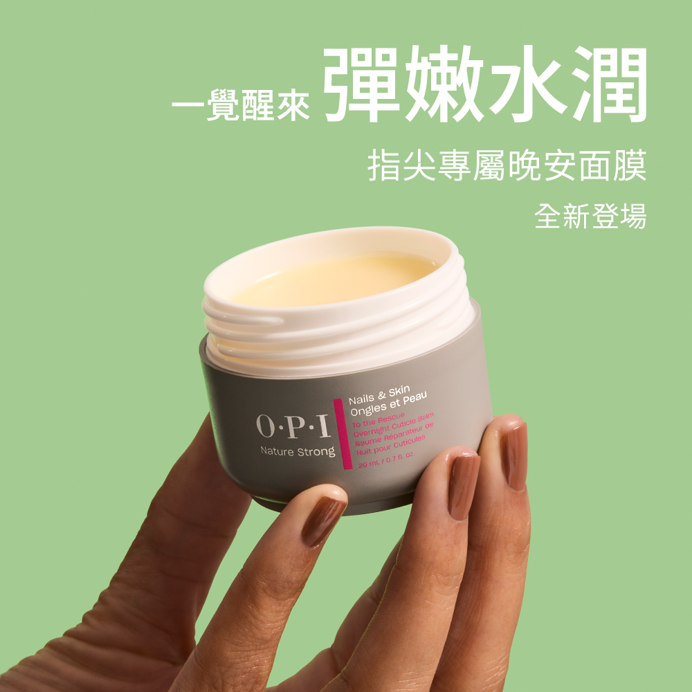 新一代OPI保養系列,加入全新養護生力軍,推出專為極度乾枯、需深層養護的崩壞指尖所設計的晚安救援面膜— 植萃全效夜間修護指緣霜。內含乳木果、荷荷芭、摩洛哥堅果及酪梨油等,具豐富不飽和脂肪酸與維生素E之高濃油脂及包膜鎖水科技,能完美修護保濕屏障、鎖住肌膚油水養分、為肌膚帶來更高密度的深層滋潤。