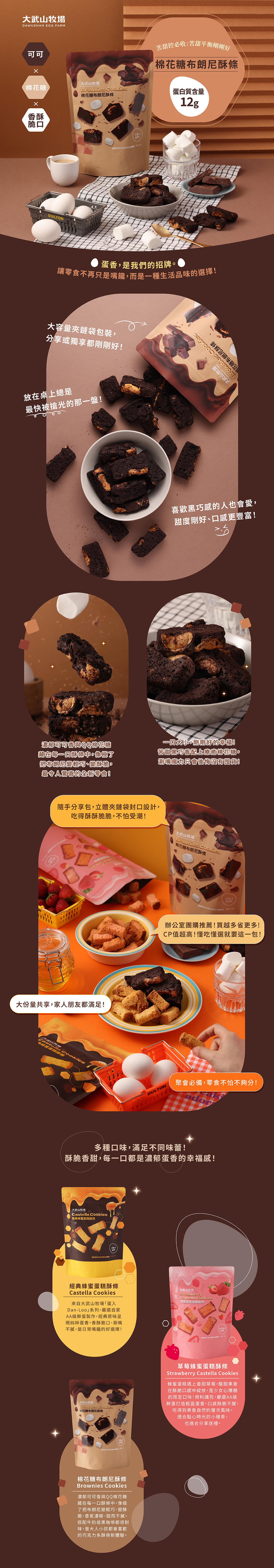 「蛋香,是我們的招牌。」濃郁可可香與QQ棉花糖藏在每一口酥條中,像極了把布朗尼變輕巧、變酥脆,香氣濃郁、甜而不膩。搭配牛奶或黑咖啡都很對味,是大人小孩都會喜歡的巧克力系酥條新體驗。