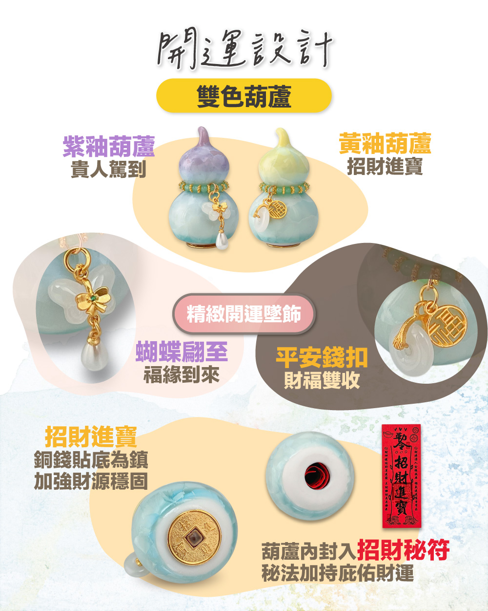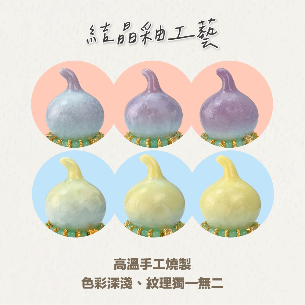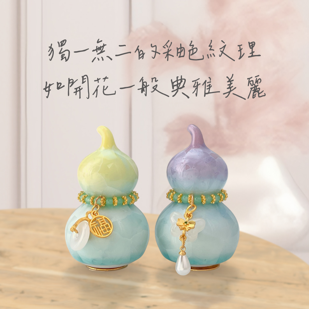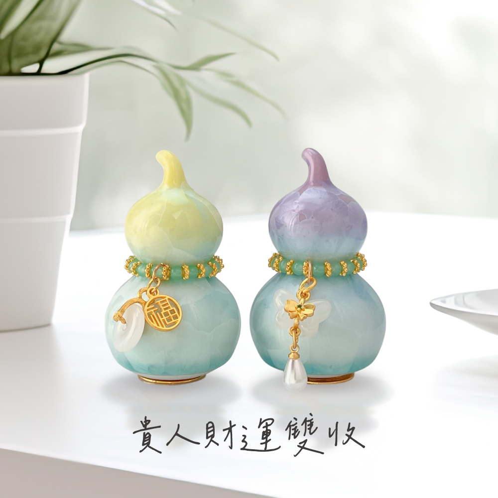 此款招財迎貴晶彩葫蘆組成雙成對,紫晶釉葫蘆主打「招貴人」:適合想在職場遇到伯樂、合作更順、提案更容易被看見的人;也很適合放在你常用的電腦旁,提醒自己保持好氣場、好人緣自然靠近。黃晶釉葫蘆主打「招財」:不管是業績目標、接案收入、偏財小確幸,都像替你的財運加上一層金色濾鏡——讓財富機會更常自動送上門!葫蘆還封入了招財秘符,有大神加持讓你的好運再升一級~