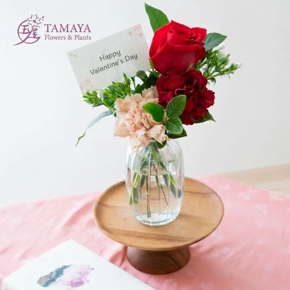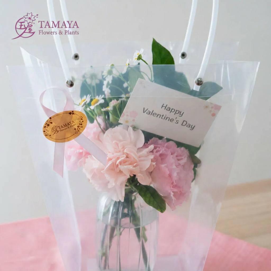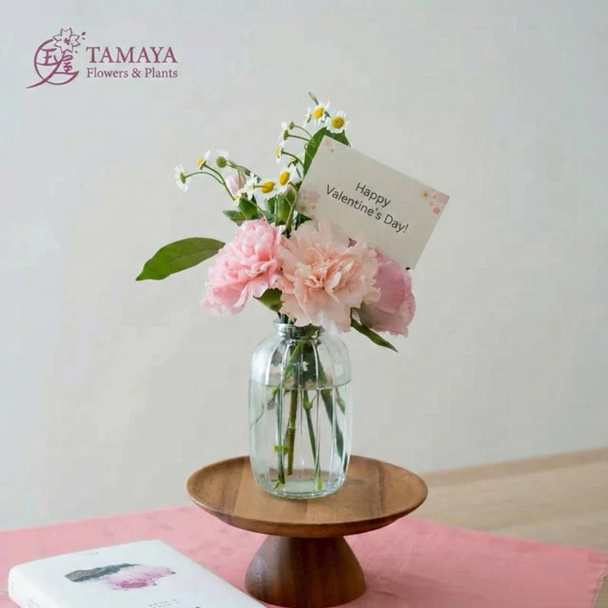 小口徑的花瓶中放入康乃馨和少許的花朵點綴,精緻且顏色豐富的花禮。