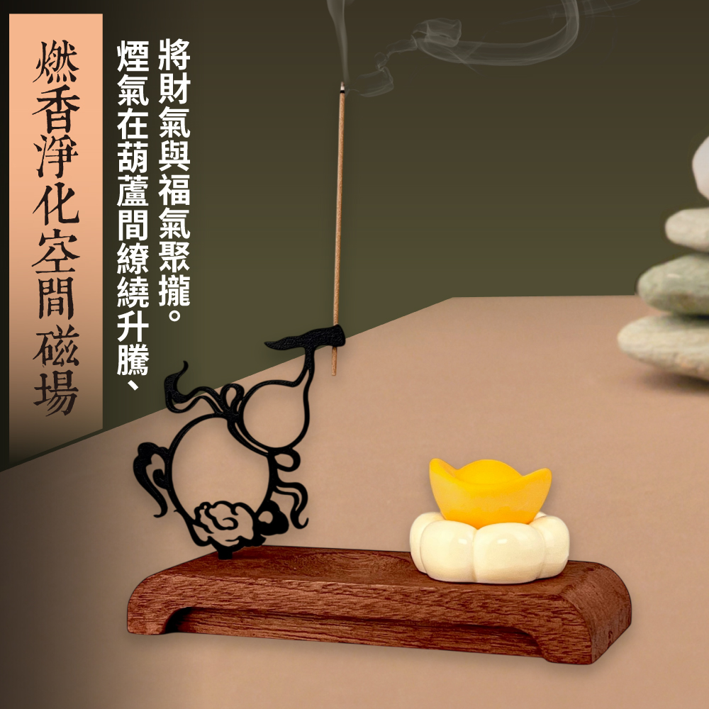 點燃線香後,裊裊香煙於葫蘆間環繞升騰,宛如財氣與福氣層層匯聚,為空間注入吉祥祥瑞之氣。光是觀賞便使人心神安定、思緒澄明;特別適合用於打坐冥想、抄經誦經之時,彷佛置身於世外桃源,充分淨化個人磁場,調和身心靈能量,回歸內在平衡。