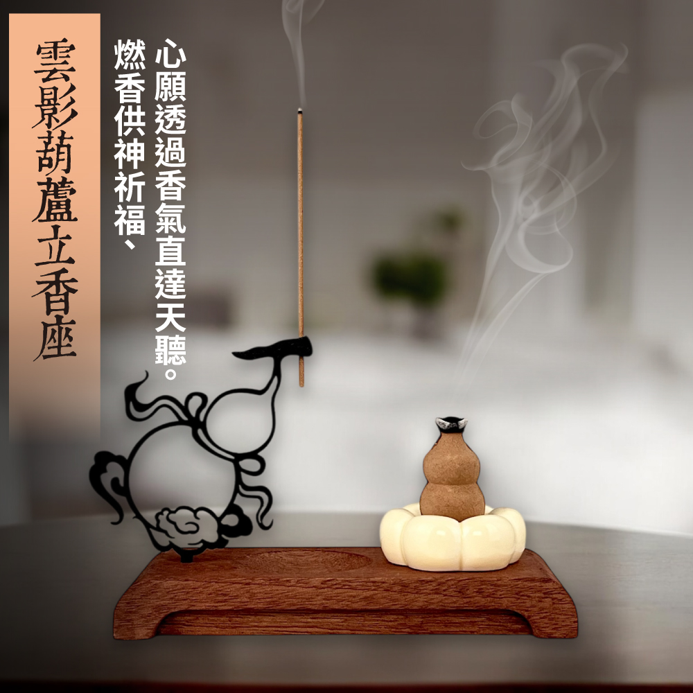《雲影葫蘆立香座》以鏤空剪影鐵藝結合溫潤木質底座,勾勒出清雅沉穩的禪風氣韻。葫蘆造型香座講究「肚大口小」,象徵收煞納福、聚氣守財,寓意福祿圓滿、家運安穩。