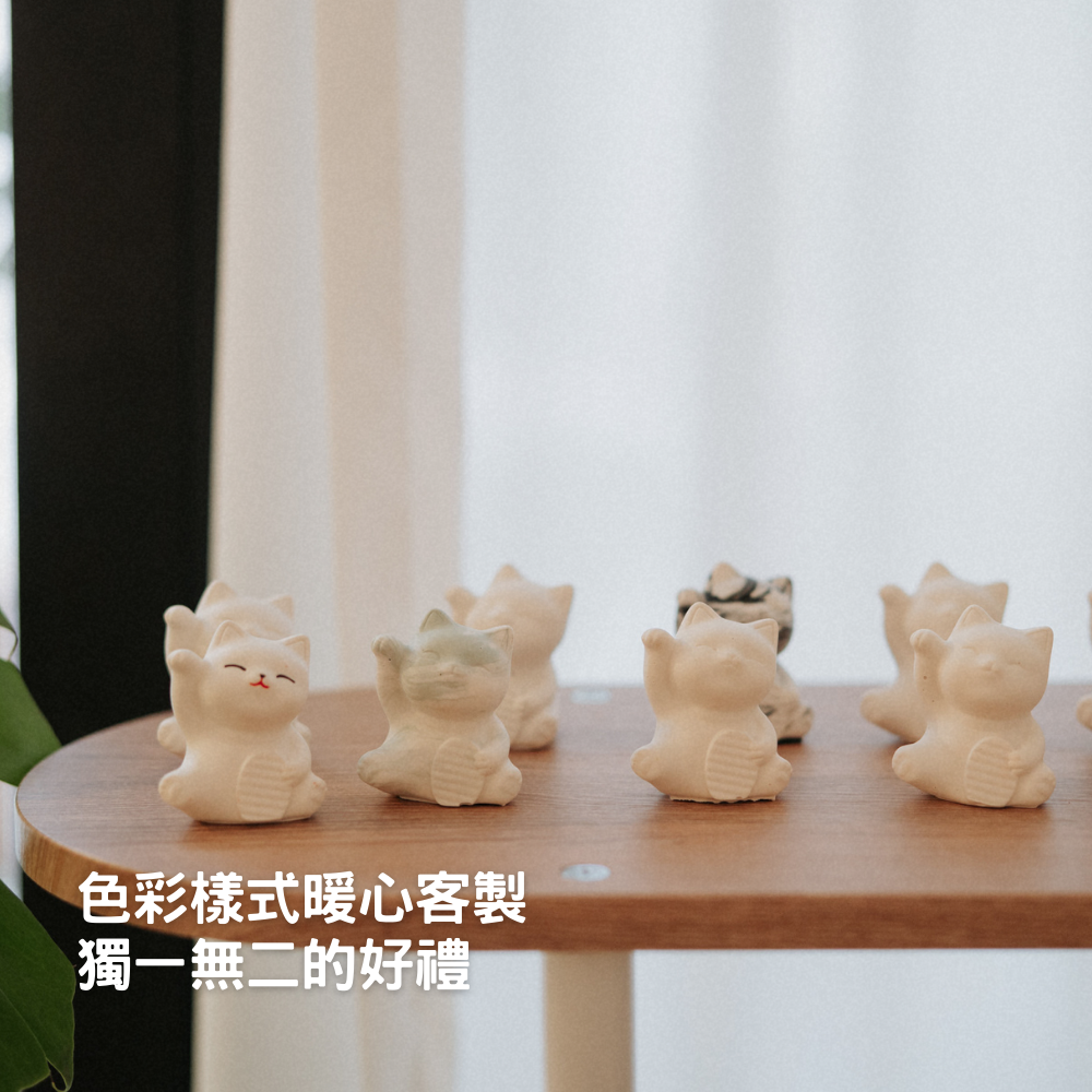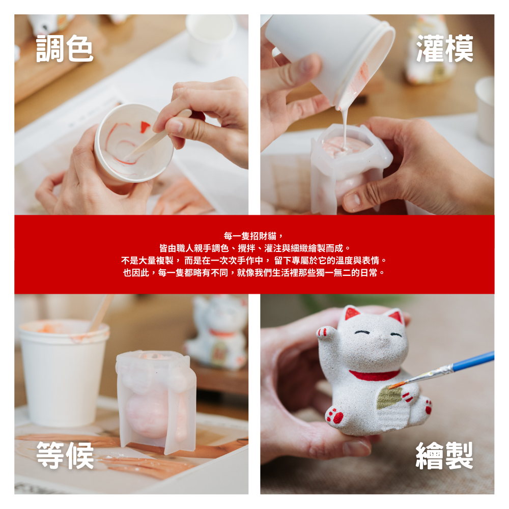 每一隻招財貓,皆由職人親手調色、攪拌、灌注與細緻繪製。